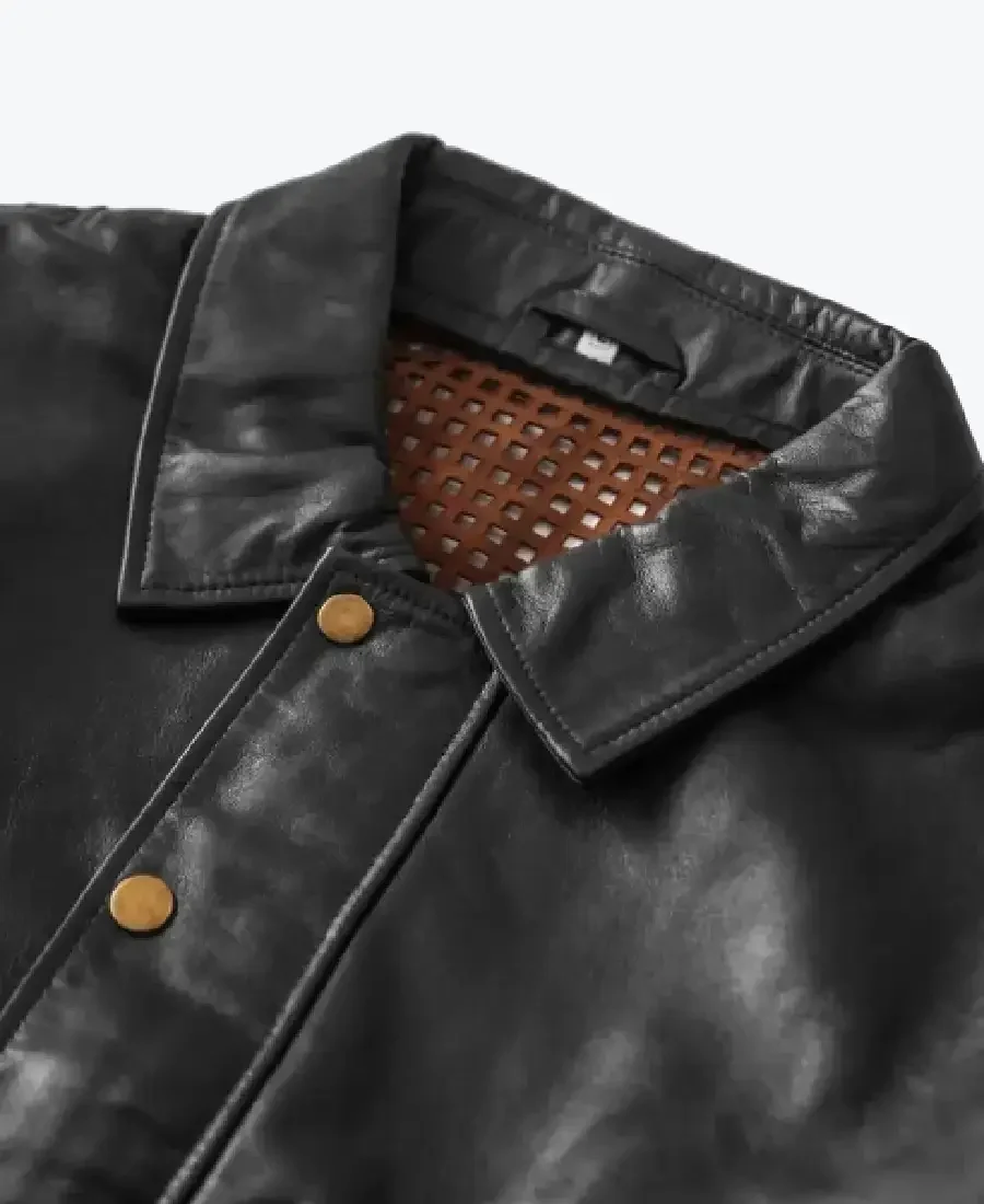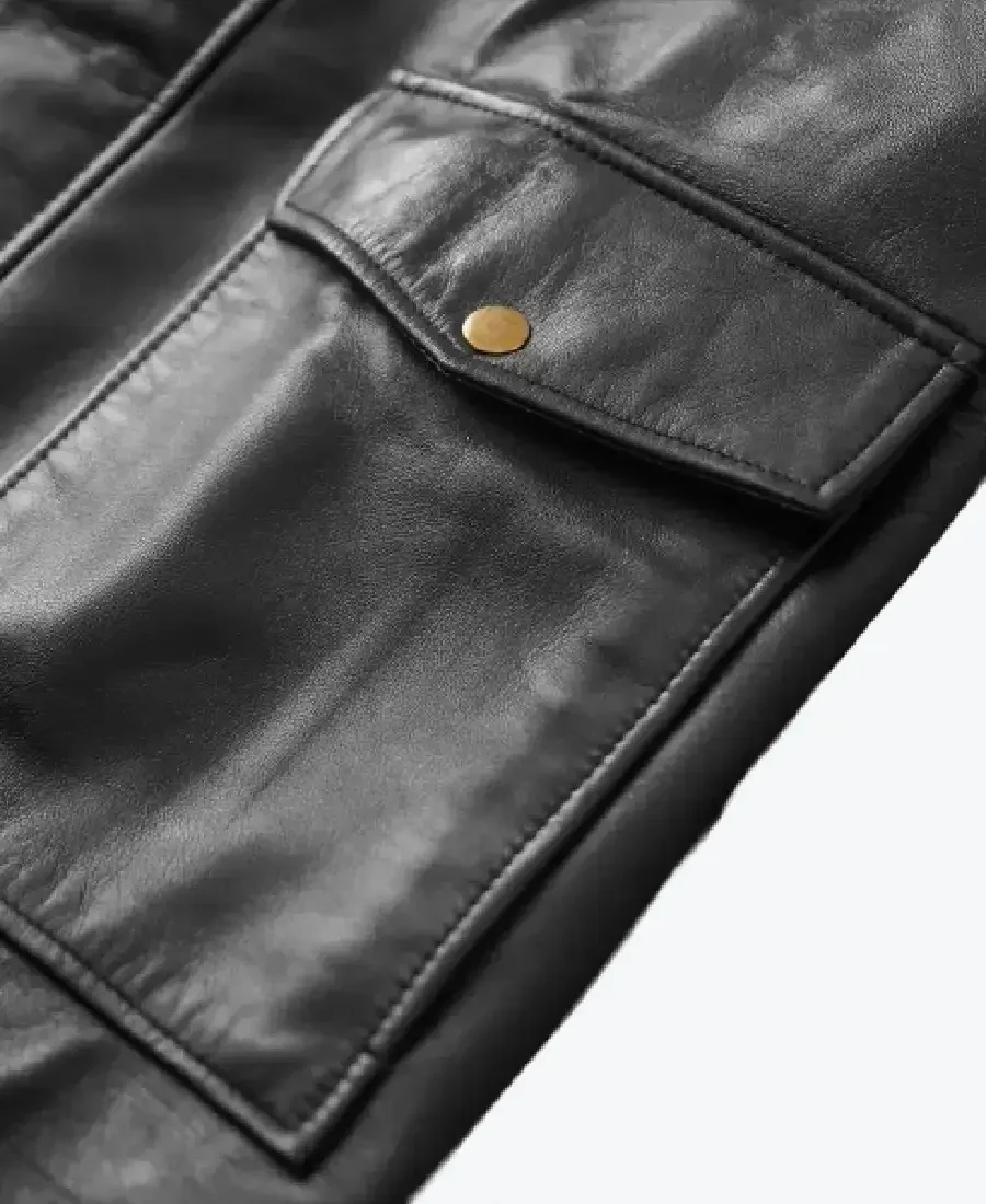 The architecture of this jacket is defined by its clean, boxy silhouette and an iconic metropolitan “industrial-chic” aesthetic. It features a sharp turn-down shirt style leather collar providing a structured and powerful frame to the neckline that exudes a classic professional vibe with a contemporary urban twist. The front is anchored by a high-performance central snap-button closure system with brass-tone hardware, maintaining a precision tailored fit profile that emphasizes the expansive leather panelling and expert anatomical seam construction. To ensure a sleek and uninterrupted profile at the extremities, the full-length sleeves are finished with clean buttoned cuffs, while the reinforced straight-cut hemline creates a sophisticated architectural volume. Designed for the individual who demands maximum organized utility within a polished frame, this Rare Jackets essential features a strategic pocket configuration including two oversized 3D-flap waist pockets and hidden inner pockets offering secure storage while reinforcing the jacket’s sleek, high-impact silhouette.