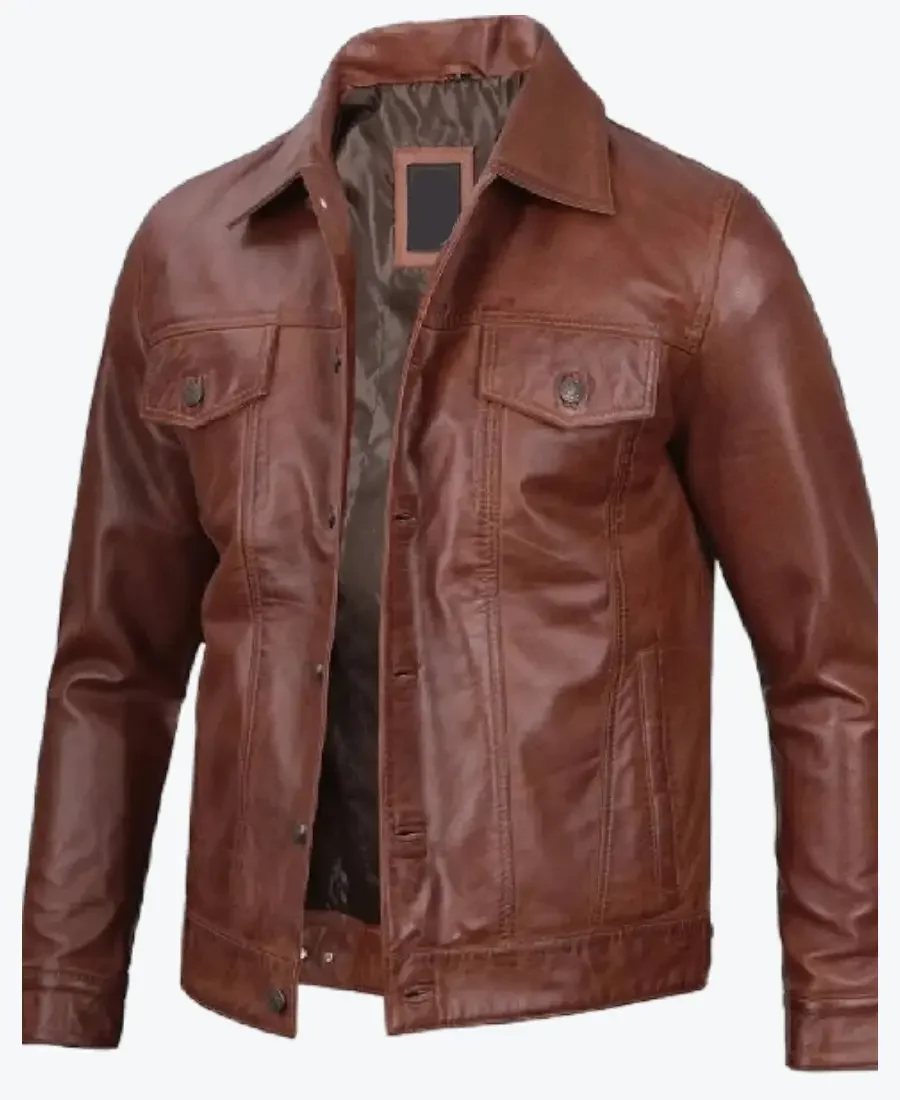 Shop The Rare Jackets Fernando Men’s Harrington Brown Leather Trucker Jacket