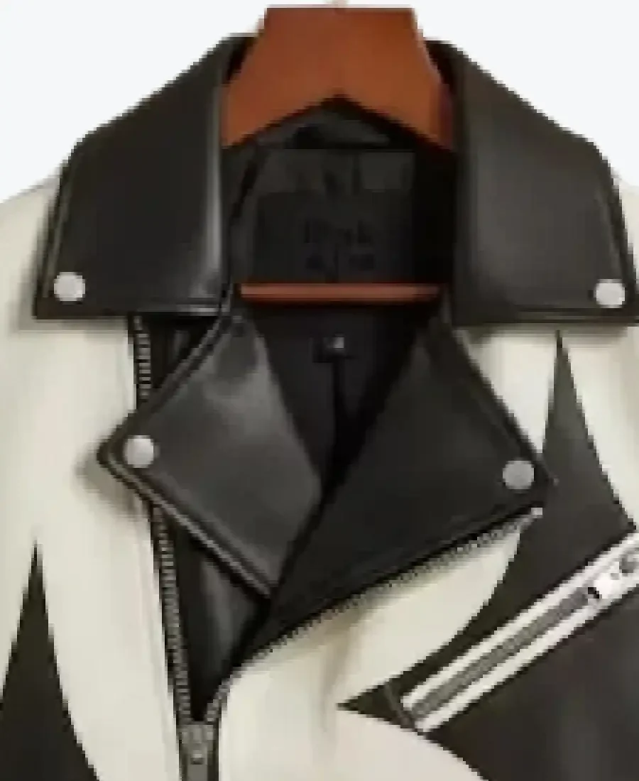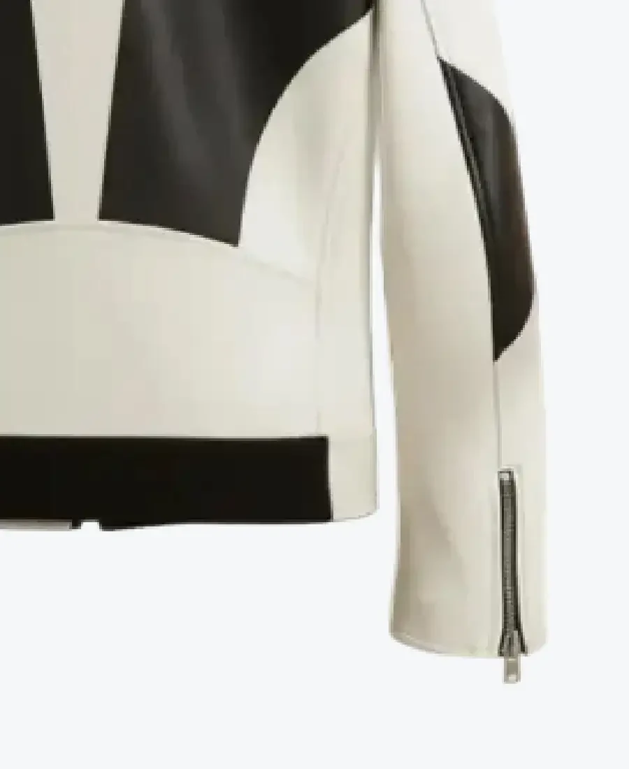 The architecture of this jacket is defined by its iconic asymmetrical lines and bold geometric starburst motifs. It features a high-contrast lapel style collar in deep black with polished snap-down detailing, lending a structured and refined frame to the neckline. The high-impact design is characterized by large, sharp black diamond-star panels that intersect the white torso, creating a powerful visual contrast that challenges traditional biker aesthetics. The front is anchored by a high-performance asymmetrical zipper closure, maintaining a precision slim-fit profile that highlights the jacket’s architectural silhouette. To ensure a custom fit and a tapered look at the wrists, the full-length sleeves are finished with high-performance zipper cuffs. Designed for the individual who demands standout utility, this Rare Jackets essential features a strategic three front zip pocket configuration (one diagonal chest zip and two vertical side zips), complemented by a decorative snap-flap coin pocket, offering secure storage while reinforcing the jacket’s powerful, high-fashion frame.