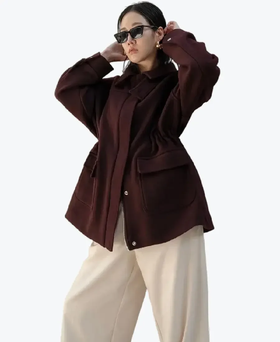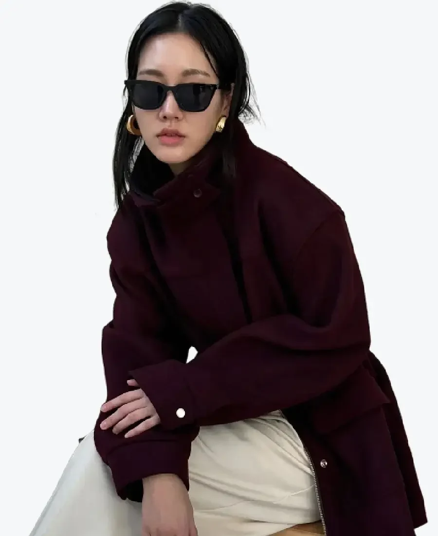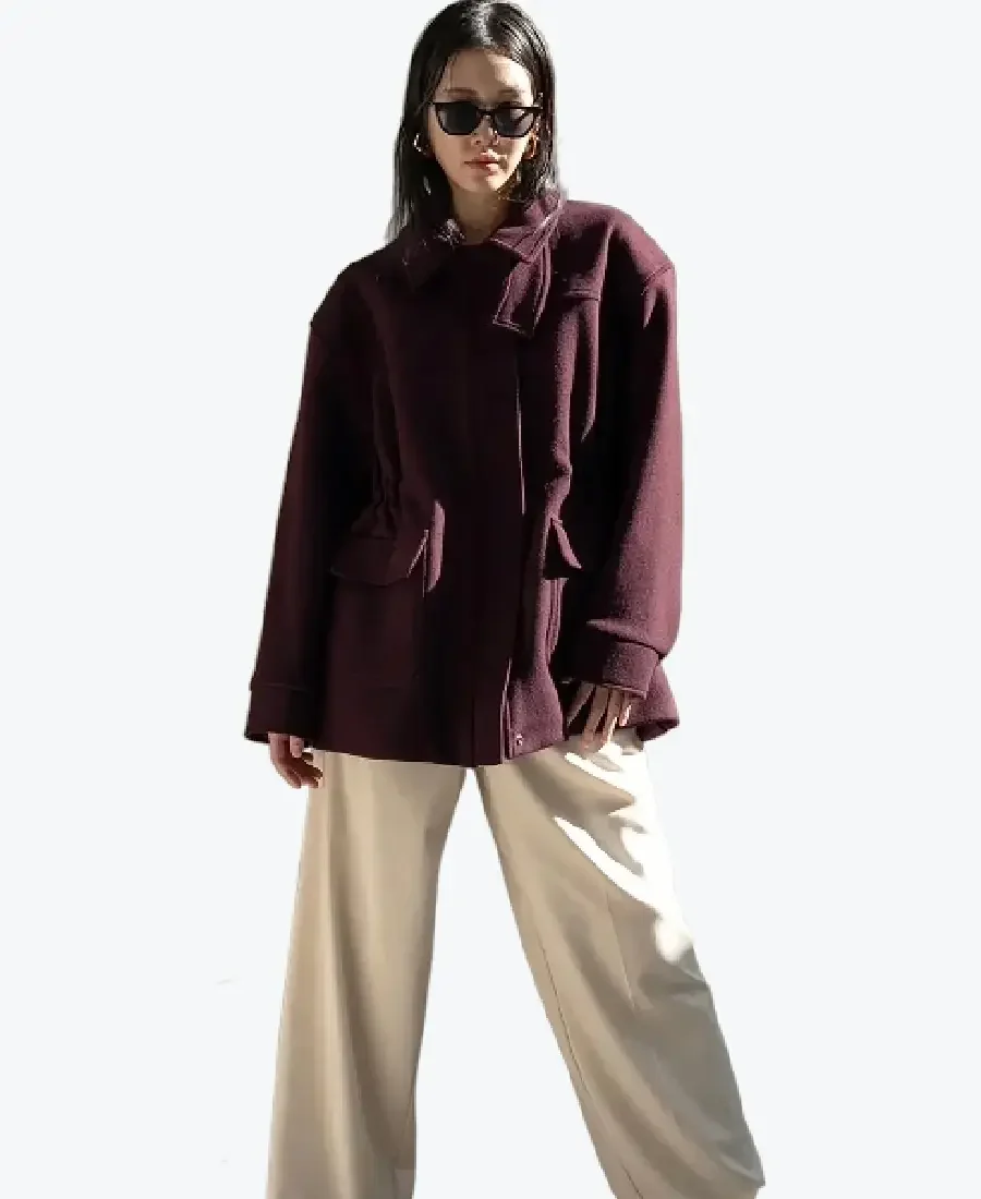 The design includes a sharp stand-up collar, offering a streamlined look while providing extra protection for your neck against the wind. A dual closure system, featuring both an industrial-grade zipper and a buttoned overlay, ensures a reinforced seal against the elements while maintaining a clean, classic profile. This jacket is highly functional, featuring three pockets in total—two waist pockets for convenient storage and one inner pocket for the secure organization of personal essentials. Full-length sleeves are finished with button cuffs, allowing you to adjust the fit at the wrists for a polished and secure appearance. The rich burgundy color provides a deep, elegant foundation that adds a touch of distinction to any outfit. This garment serves as a versatile centerpiece for your outerwear collection and stands as a piece of premium craftsmanship.