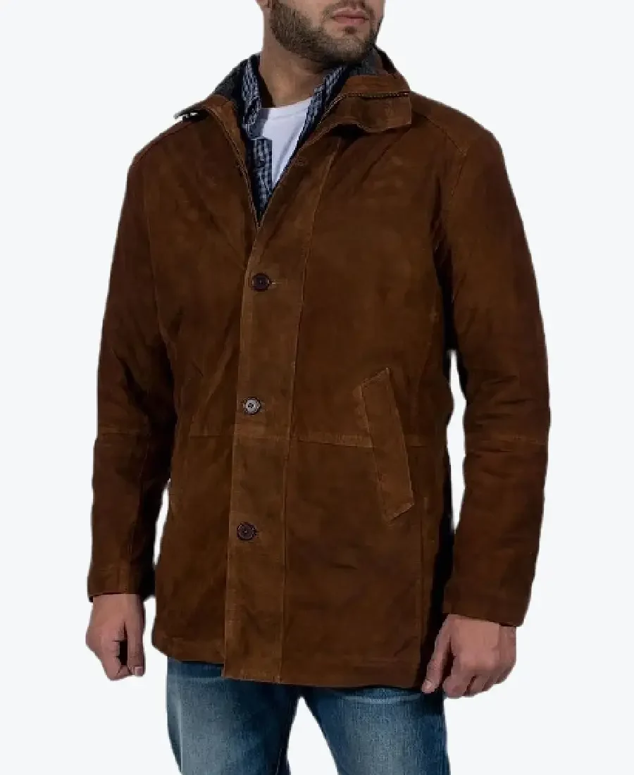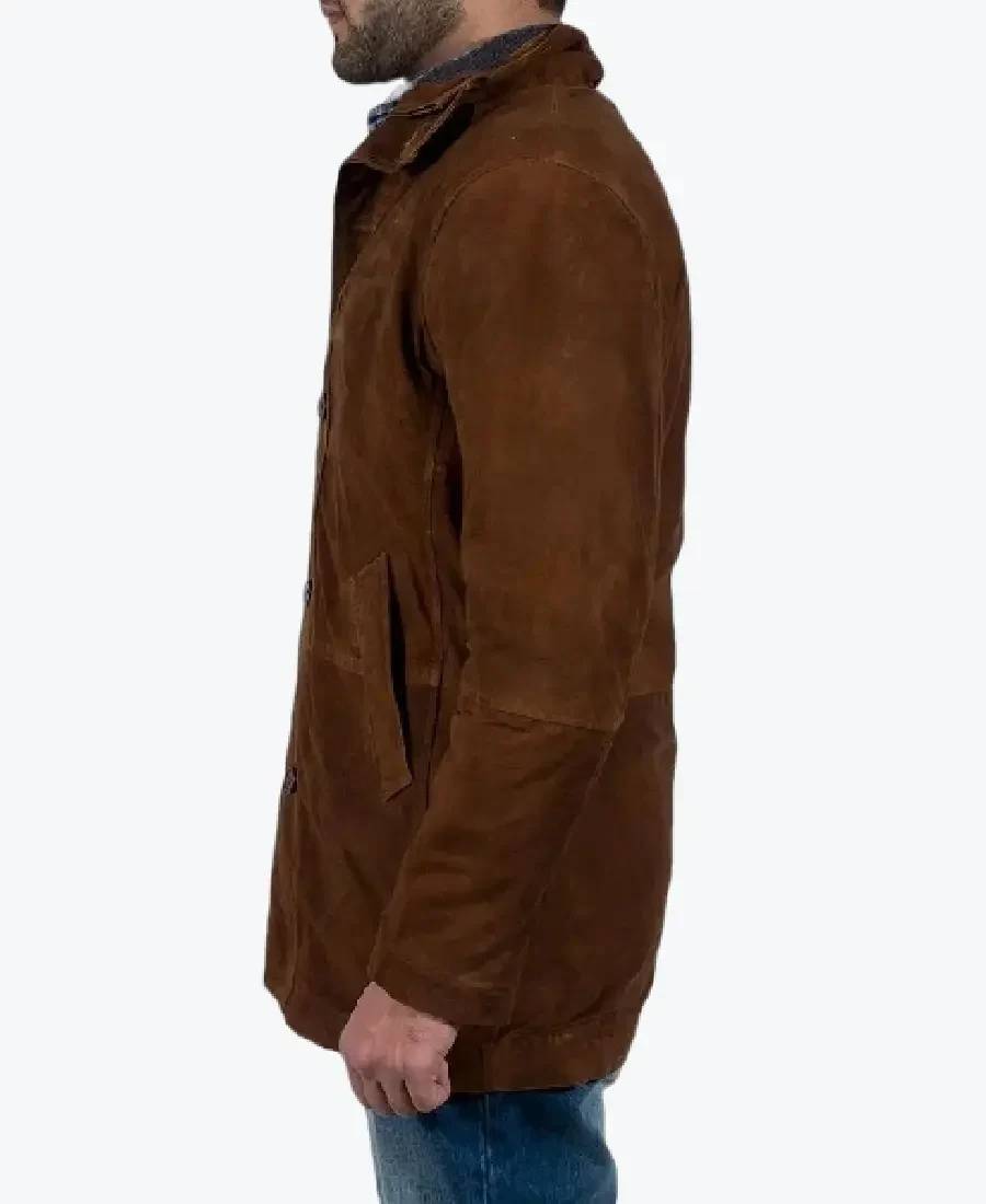 The design features a classic stand-up collar, offering a clean and structured look that adds a touch of modern sophistication to the jacket’s profile. A versatile dual closure system, featuring both a high-quality zipper and buttons, ensures a secure and reliable fit while providing a sharp, layered appearance. This jacket is practical and streamlined, featuring two side pockets for convenient storage and hand warmth. Full-length sleeves are finished with open hem cuffs, providing a clean and fluid finish at the wrists that facilitates easy movement and a relaxed feel. The rich brown color provides a warm and versatile foundation that coordinates effortlessly with any ensemble, from blue denim to neutral chinos. This garment improves with age as the suede matures and develops a unique character over time. It serves as a reliable and stylish centerpiece for your outerwear collection and stands as a piece of premium craftsmanship.