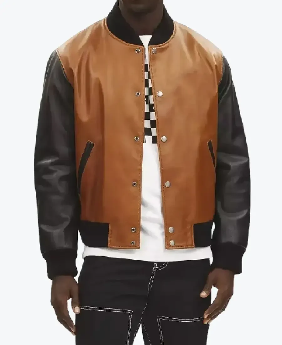 The Kirk Men’s Brown and Black Leather Varsity Jacket by Rare Jackets is a masterclass in high-contrast collegiate design and precision luxury meticulously handcrafted from premium cowhide leather or high-grade faux leather. Drenched in a commanding duo of rich caramel brown and obsidian black, this piece leverages a robust high-grade grain and natural wind-resistant properties to provide a formidable protective shell. The leather is selected for its industrial-grade durability and a sophisticated semi-matte buttery finish, ensuring the jacket maintains a sharp authoritative frame while projecting a raw, high-fashion energy. Inside, the garment is fully integrated with a silky viscose lining, providing a breathable and friction-free experience for maximum all-day comfort.