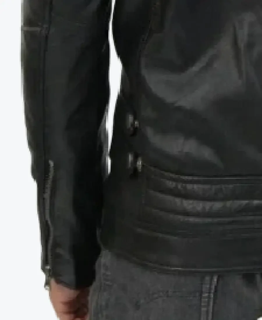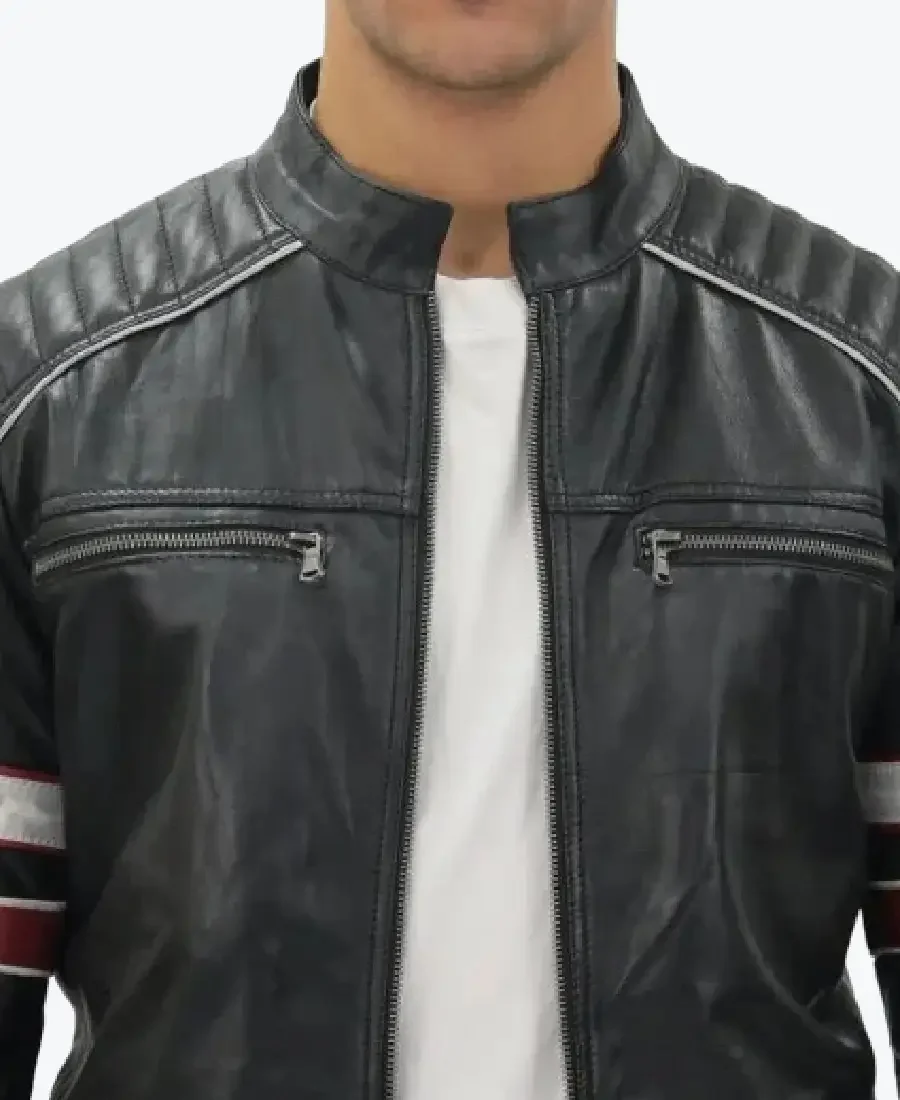 The architecture of this jacket is defined by its clean, aerodynamic lines and iconic ribbed quilted padding that dominates the shoulders and upper arms, lending a structured and powerful frame to the silhouette. It features a contemporary stand-up collar with a secure snap-tab closure, providing a streamlined frame to the neckline that exudes a classic racer aesthetic. The high-impact design is further enhanced by dual ivory and maroon racing stripes on the mid-sleeves, creating a bold visual contrast against the dark leather. The front is anchored by a high-performance centered zipper closure, flanked by dual horizontal chest zip pockets that enhance the jacket’s architectural profile and maintain a precision slim-fit. To ensure a custom fit and a tapered look at the wrists, the full-length sleeves are finished with high-performance zipper cuffs. Designed for the individual who demands maximum organized utility, this Rare Jackets essential features a strategic six-pocket configuration, including two chest zips, two vertical side zip pockets, and two hidden inner pockets, offering secure storage while reinforcing the jacket’s powerful silhouette.