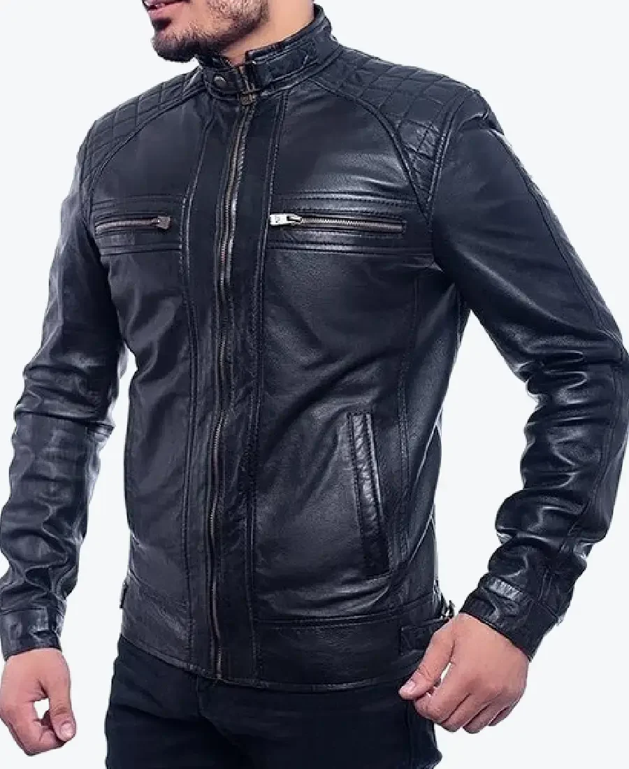 The architecture of this jacket is defined by its ultra-sleek aerodynamic silhouette and an iconic metropolitan “speedway-elite” aesthetic. It features a sharp erect belted collar with a secure buckle-style snap, providing a structured and powerful frame to the neckline that exudes a classic professional vibe with a contemporary urban twist. The front is anchored by a high-performance central silver zipper closure, maintaining a precision tailored fit profile that emphasizes the intricate diamond-quilted shoulder yokes and expert anatomical seam construction. To ensure a custom look and tapered profile at the extremities, the full-length sleeves are finished with clean snap-tab cuffs, while the reinforced horizontal panelling at the hem creates a sophisticated architectural volume. Designed for the individual who demands maximum organized utility within a polished frame, this Rare Jackets essential features a strategic six-pocket configuration including two technical horizontal zipper chest pockets, two discreet vertical side entry zipper pockets, and two hidden inner pockets—offering secure storage while reinforcing the jacket’s sleek, high-impact silhouette.