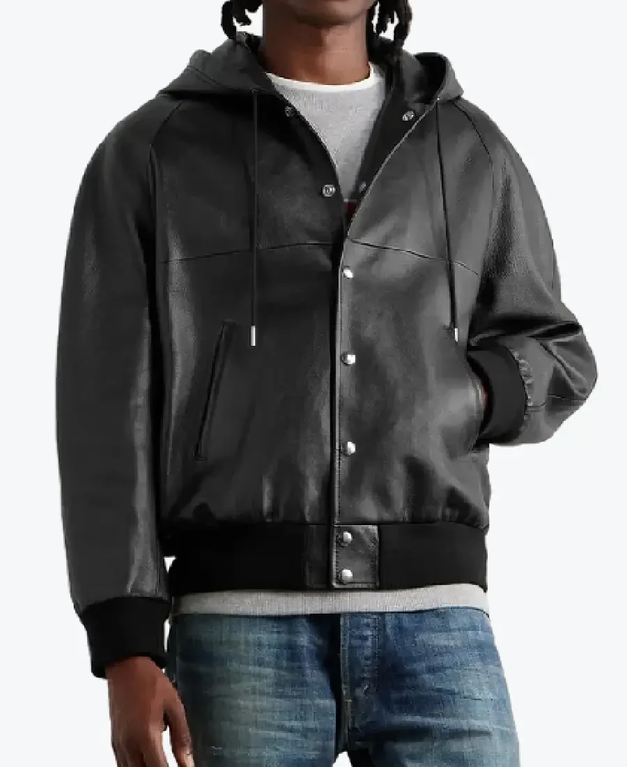 The architecture of this jacket is defined by its structured, oversized blouson silhouette and an iconic metropolitan “athleisure-noir” aesthetic. It features a spacious, integrated leather hood with adjustable drawstrings, providing a powerful and functional frame to the neckline that exudes a classic professional vibe with a contemporary urban twist. The front is anchored by a high-performance central snap-button closure system with reinforced silver-tone hardware, maintaining a precision tailored fit profile that emphasizes the unique raglan sleeve construction and expert horizontal chest seam. To ensure maximum heat retention and a tapered profile at the extremities, the full-length sleeves and waist are finished with high-impact charcoal rib-knitted cuffs and a matching waistband, while the reinforced anatomical panelling creates a sophisticated architectural volume. Designed for the individual who demands maximum organized utility within a polished frame, this Rare Jackets essential features a strategic pocket configuration including two discreet slanted side entry welt pockets and a hidden inner pocket—offering secure storage while reinforcing the jacket’s sleek, high-impact silhouette.