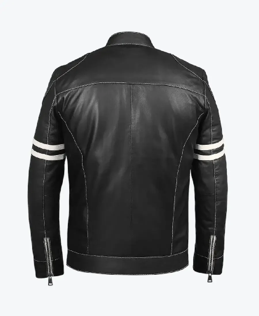 The architecture of this jacket is defined by its clean, aerodynamic lines and iconic dual white racing stripes on the sleeves, which lend a high-impact visual contrast and a raw, racer-inspired energy. It features a contemporary erect collar with a secure snap-button finish, providing a streamlined and secure frame to the neckline. The front is anchored by a high-performance zipper closure, maintaining a precision profile that transitions seamlessly from open-road adventures to urban social settings. To ensure a natural and relaxed drape at the wrists, the full-length sleeves are finished with clean open hem cuffs, allowing for effortless movement. Designed for the practical minimalist, this Rare Jackets essential features a strategic three-pocket configuration, including one horizontal chest zip and two side pockets, offering secure, quick-access storage while reinforcing the jacket’s powerful, architectural silhouette.