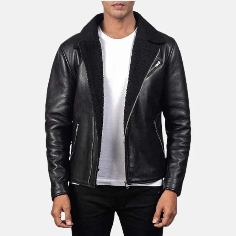 The architecture of this jacket is defined by its structured, asymmetric silhouette and an iconic metropolitan “stealth-aviator” aesthetic. It features a sharp, oversized lapel-style collar fully lined with deep obsidian faux fur, providing a powerful frame to the neckline and superior thermal protection that exudes a classic professional vibe with a contemporary urban twist. The front is anchored by a high-performance asymmetric silver zipper closure, maintaining a precision tailored fit profile that emphasizes the unique cross-body construction and expert anatomical seam detailing. To ensure a custom look and tapered profile at the extremities, the full-length sleeves are finished with high-impact silver zipper cuffs, while the reinforced hemline creates a sophisticated architectural volume. Designed for the individual who demands maximum organized utility within a polished frame, this Rare Jackets essential features a strategic five-pocket configuration including one technical slanted zipper chest pocket, two discreet vertical side entry zipper pockets, and two hidden inner pockets—offering secure storage while reinforcing the jacket’s sleek, high-impact silhouette.