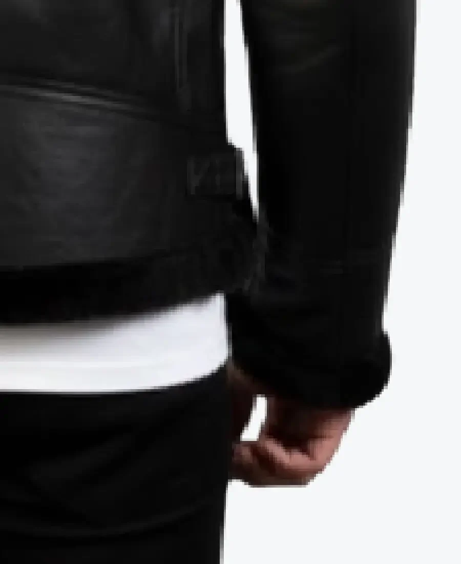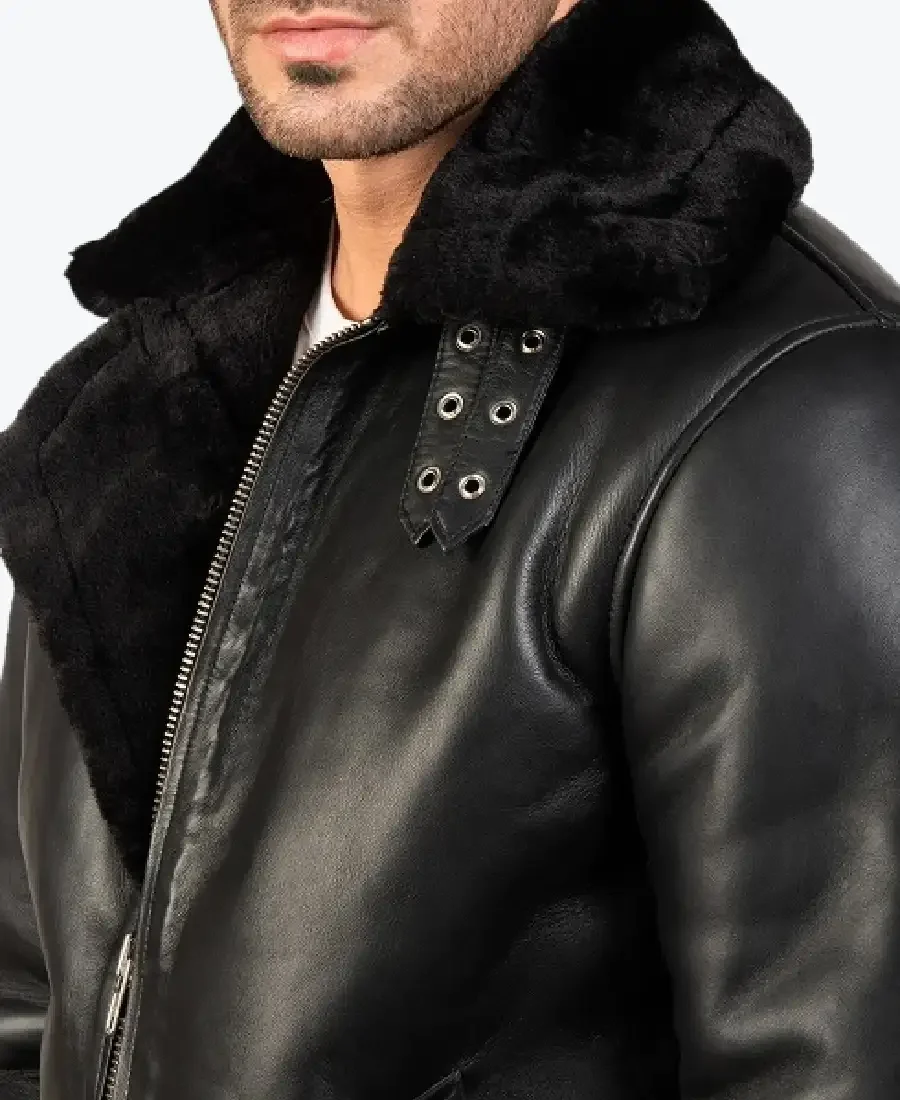 The architecture of this jacket is defined by its clean, aerodynamic lines and iconic exposed shearling trim. It features a bold, black shearling-lined collar equipped with dual adjustable leather buckle straps, providing a secure and powerful frame to the neckline that exudes a classic military B-3 aesthetic. The front is anchored by a high-performance centered zipper closure, maintaining a precision regular-fit profile that allows for comfortable layering over heavy knits. To ensure maximum heat retention and a custom length at the wrists, the full-length sleeves are finished with versatile roll-back shearling cuffs, complemented by a thick shearling-trimmed hemline and adjustable side waist buckles for an architectural cinch. Designed for the individual who demands standout utility within a stealth frame, this Rare Jackets essential features a strategic three-pocket configuration, including two angled side welt pockets and a hidden inner pocket, offering secure storage while reinforcing the jacket’s powerful, high-impact silhouette.