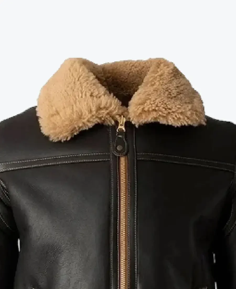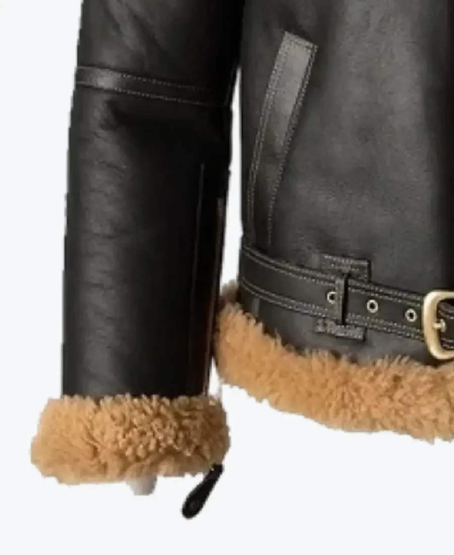 The architecture of this jacket is defined by its structured, heavy-duty silhouette and an iconic metropolitan “battle-ready-aviator” aesthetic. It features a sharp oversized classic collar fully lined with honey-amber shearling fur, providing a powerful frame to the neckline and superior thermal protection that exudes a classic professional vibe with a contemporary urban twist. The front is anchored by a high-performance central bronze zipper closure with a reinforced leather wind flap, maintaining a precision tailored fit profile that emphasizes the unique horizontal chest yokes and expert anatomical seam construction. To ensure a custom look and tapered profile at the extremities, the full-length sleeves and hem are finished with high-impact shearling fur cuffs, while the waist is secured by a striking integrated buckled leather belt that creates a sophisticated architectural volume. Designed for the individual who demands maximum organized utility within a polished frame, this Rare Jackets essential features a strategic pocket configuration including two technical vertical side entry welt pockets and a hidden inner pocket—offering secure storage while reinforcing the jacket’s sleek, high-impact silhouette.