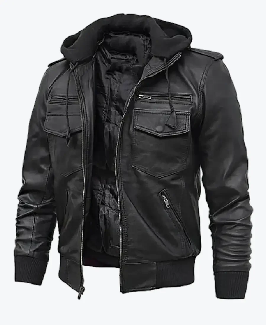 Shop The Rare Jackets Men’s Black Hooded Bomber Leather Jacket
