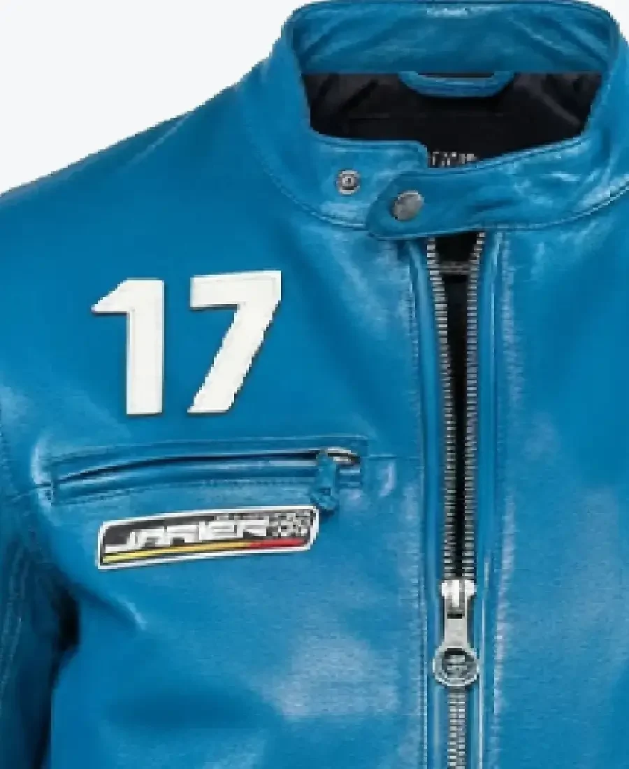 The architecture of this jacket is defined by its clean, aerodynamic lines and iconic professional racing motifs. It features a contemporary erect collar with a secure snap-tab closure, providing a streamlined frame to the neckline that exudes a classic cafe-racer aesthetic. The high-impact design is characterized by dual vertical ivory racing stripes flanking the central zip and a signature “17” numerical graphic on the chest, lending a structured and powerful frame to the silhouette. The front is anchored by a high-performance centered zipper closure, flanked by dual vertical side zip pockets and a horizontal chest zip pocket that enhance the jacket’s architectural profile. To ensure a custom fit and a tapered look at the wrists, the full-length sleeves are finished with high-performance zipper cuffs, complemented by authentic racing patches on the shoulders. Designed for the individual who demands standout utility, this Rare Jackets essential features a strategic three front zip pocket configuration, offering secure storage while reinforcing the jacket’s powerful, athletic silhouette.