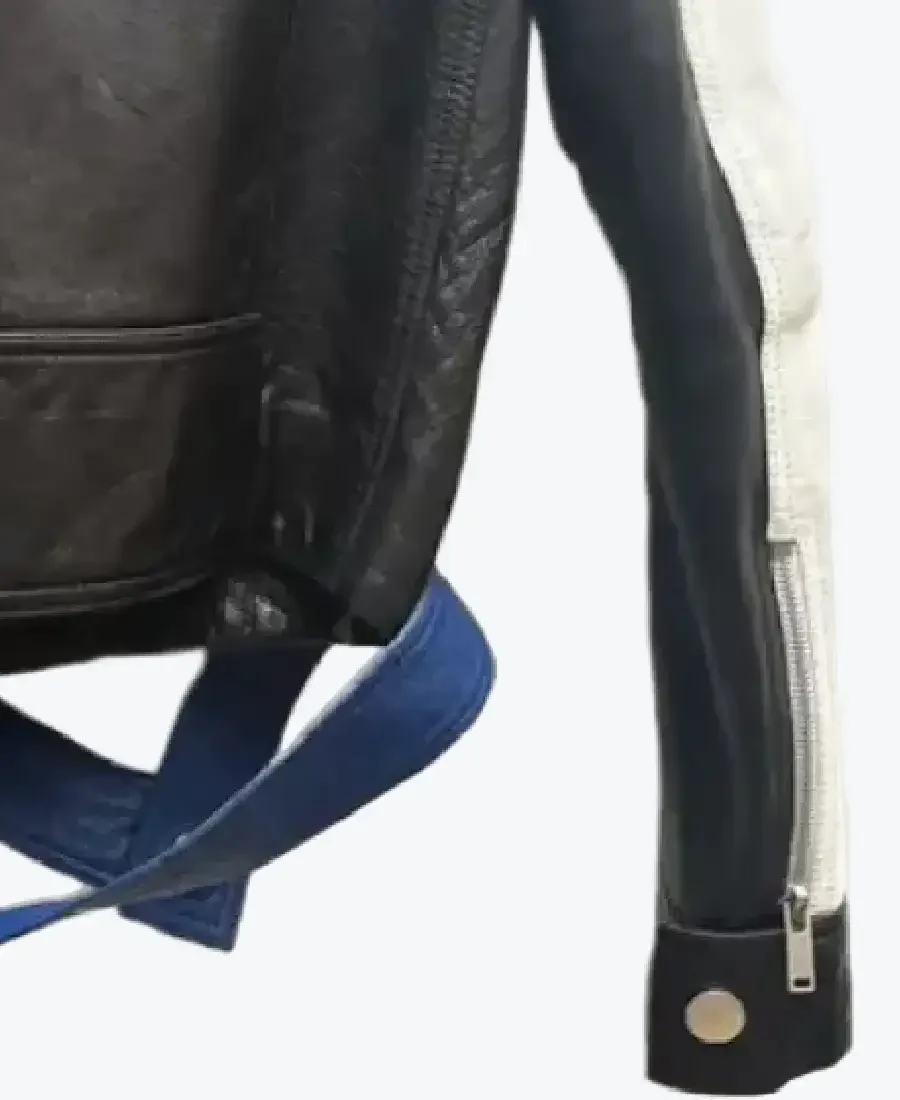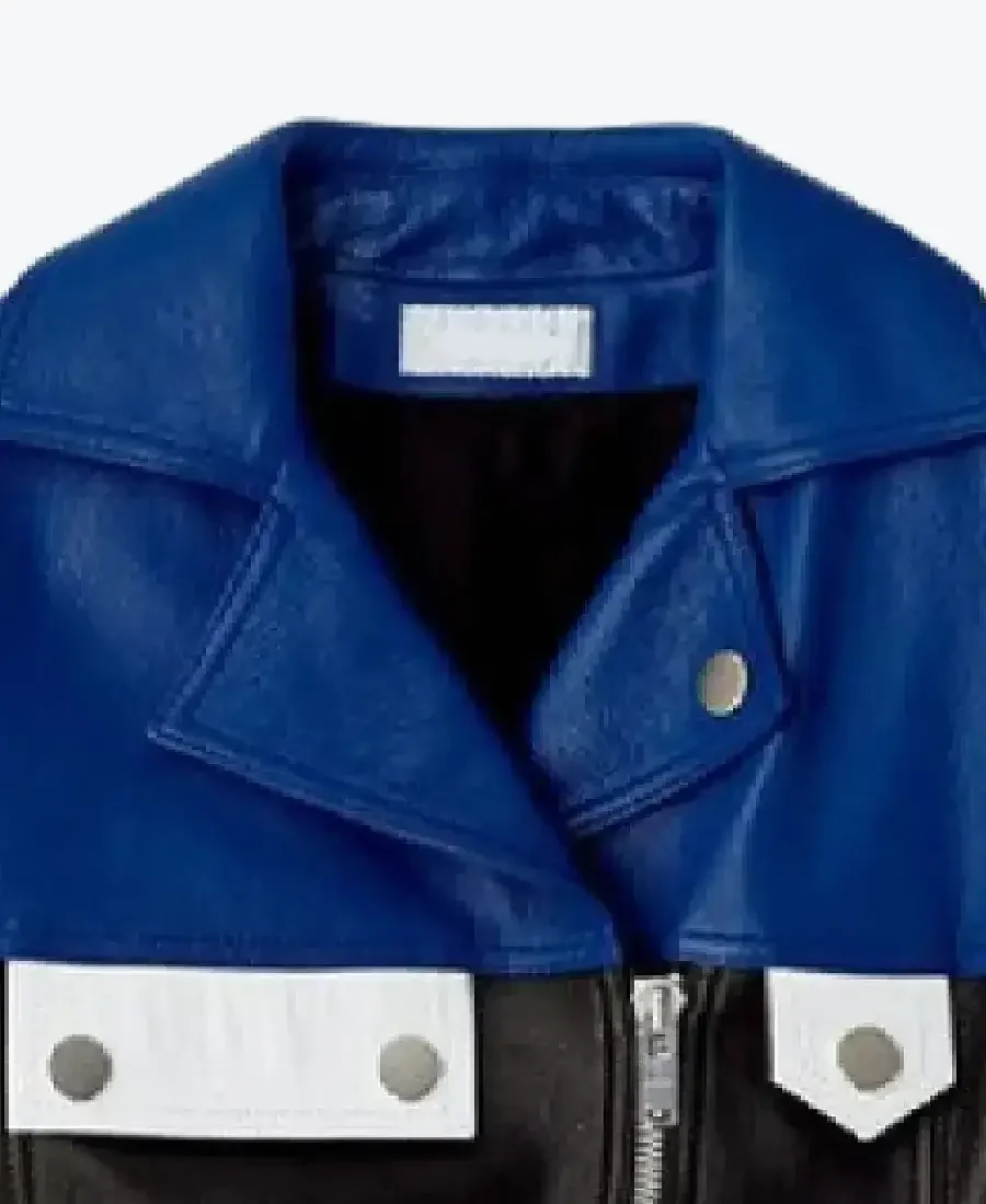 The architecture of this jacket is defined by its iconic asymmetrical lines and high-contrast geometric detailing. It features a bold lapel style collar in vibrant blue with military-inspired epaulets, lending a structured and powerful frame to the silhouette. The high-impact design is characterized by diamond-quilted padding on the shoulders and contrasting white panels on the sleeves, creating a bold, racing-inspired visual. The front is anchored by a high-performance asymmetrical zipper closure, complemented by a strategic blue waist belt with a secure snap-button closure for an architectural cinch. To ensure a custom fit, the full-length sleeves are finished with high-performance snap-button and zipper cuffs, reinforced by ivory chest flaps with polished silver-tone buttons. Designed for the individual who demands standout utility, this Rare Jackets essential features a strategic two vertical side zip pocket configuration, offering secure storage while reinforcing the jacket’s powerful, high-fashion silhouette.