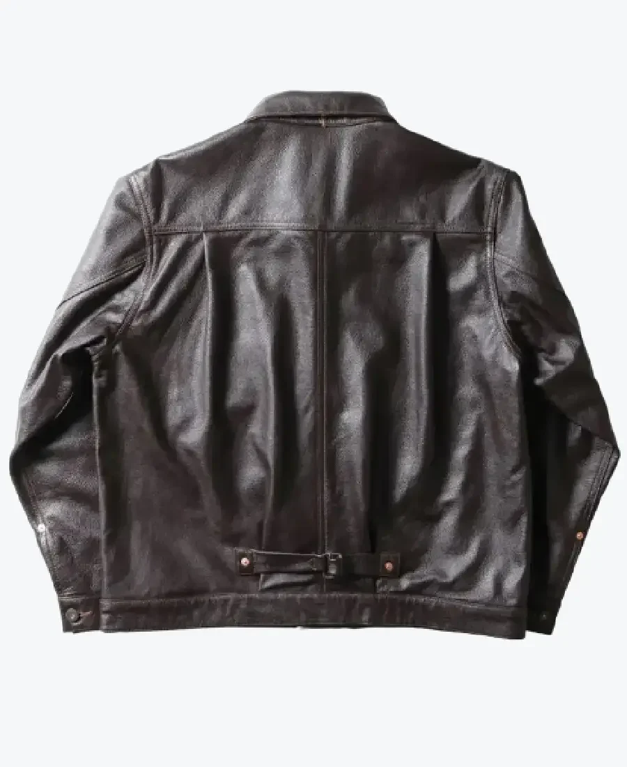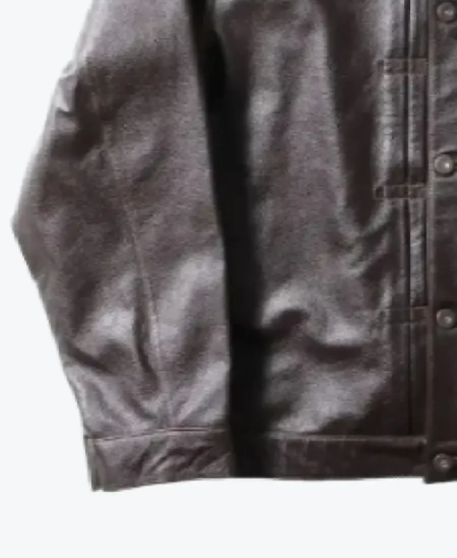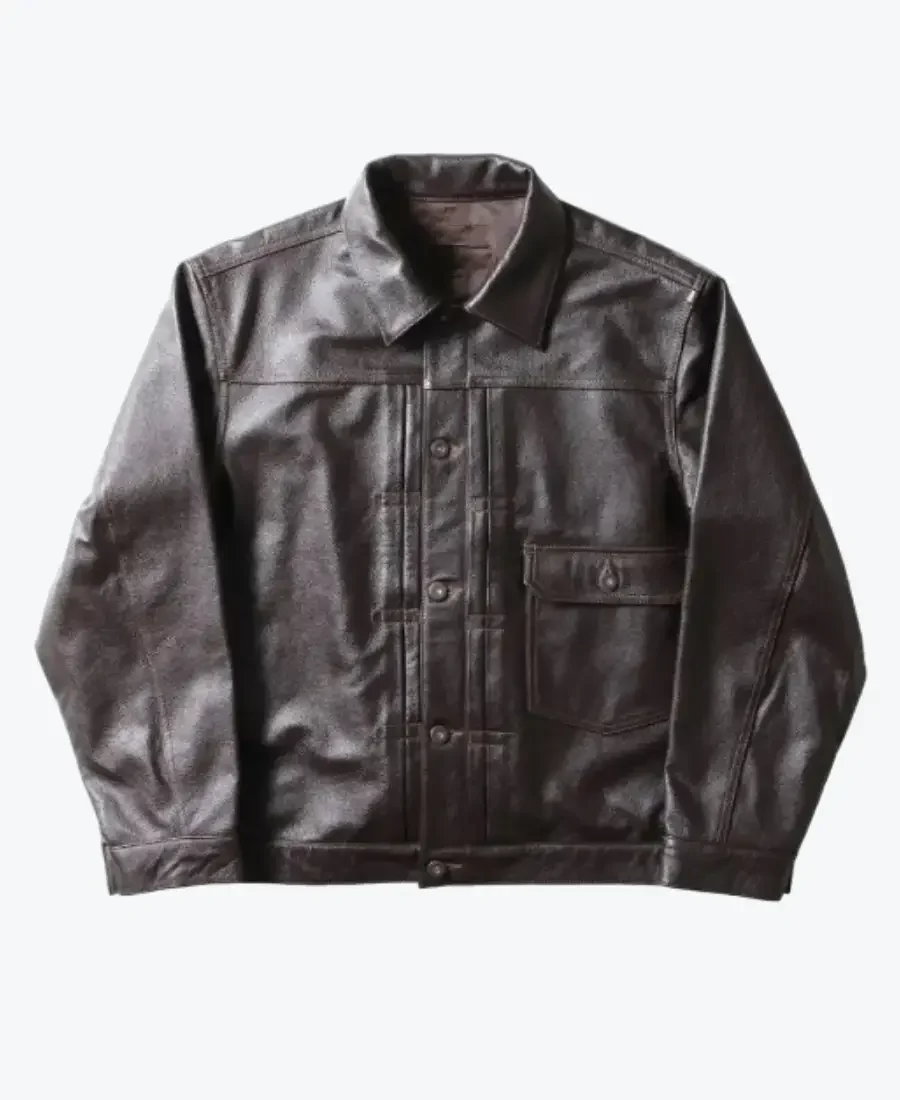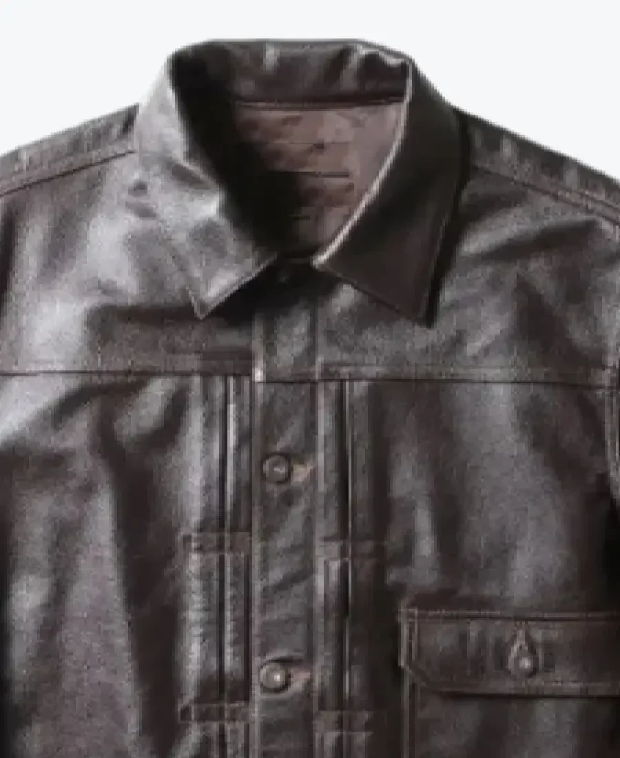 The architecture of this jacket is defined by its structured, vintage-inspired silhouette and an iconic metropolitan “trucker-luxe” aesthetic. It features a sharp turn-down shirt style leather collar providing a powerful frame to the neckline that exudes a classic professional vibe with a contemporary urban twist. The front is anchored by a high-performance central buttoned closure system with reinforced silver-tone hardware, maintaining a precision tailored fit profile that emphasizes the unique “Type-1” pleated front detailing and expert horizontal yoke construction. To ensure a sleek and uninterrupted profile at the extremities, the full-length sleeves are finished with clean buttoned cuffs, while the reinforced straight-cut hemline creates a sophisticated architectural volume. Designed for the individual who demands maximum artistic flair within a polished frame, this Rare Jackets essential features a strategic pocket configuration including one expansive snap-button flap chest pocket and hidden inner pockets offering secure storage while reinforcing the jacket’s sleek, high-impact silhouette.