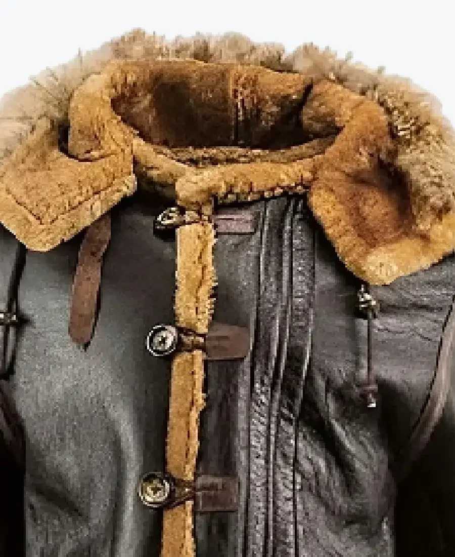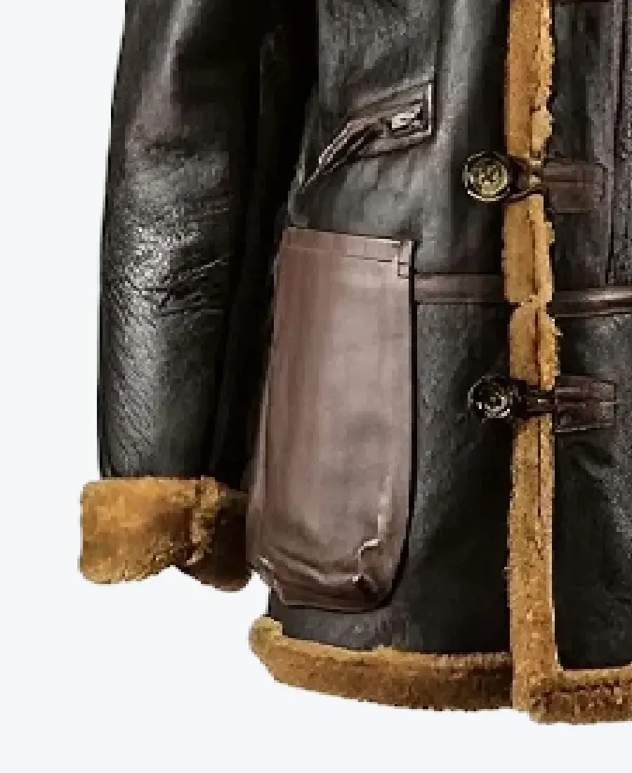 The architecture of this jacket is defined by its clean, aerodynamic lines and iconic exposed shearling trim. It features a high-performance hooded style fur collar, providing a textured and powerful frame to the neckline that exudes a classic WWII B-7 Aleutian aesthetic. The front is anchored by a high-performance buttoned closure with authentic leather loop toggles, reinforced by a thick vertical shearling placket and sophisticated vertical pleated detailing on the chest for added structural depth. To ensure maximum heat retention at the extremities, the full-length sleeves and hemline are finished with thick fur-trimmed open hem cuffs, complemented by dark mahogany leather patch detailing at the waist. Designed for the individual who demands maximum organized utility within a legendary frame, this Rare Jackets essential features a strategic six-pocket configuration, including two diagonal zip chest pockets, two oversized front patch pockets, and two hidden inner pockets, offering secure storage while reinforcing the jacket’s powerful, high-impact silhouette.