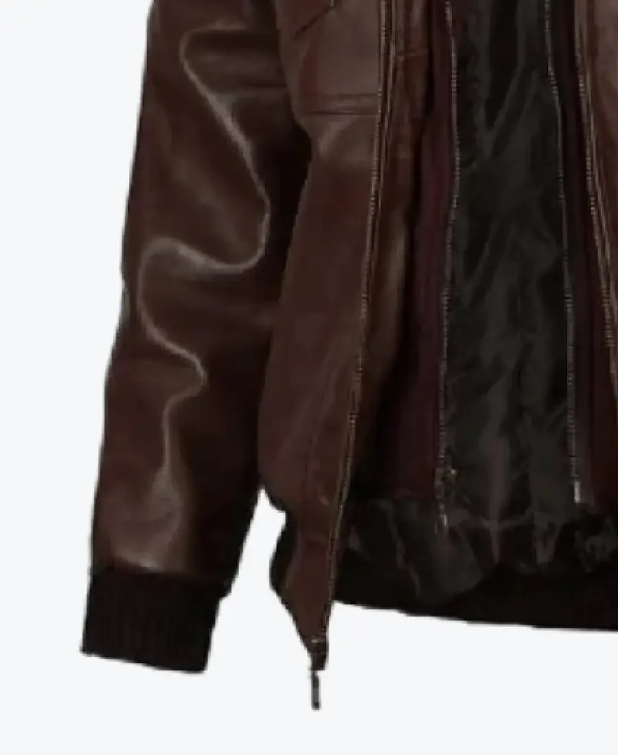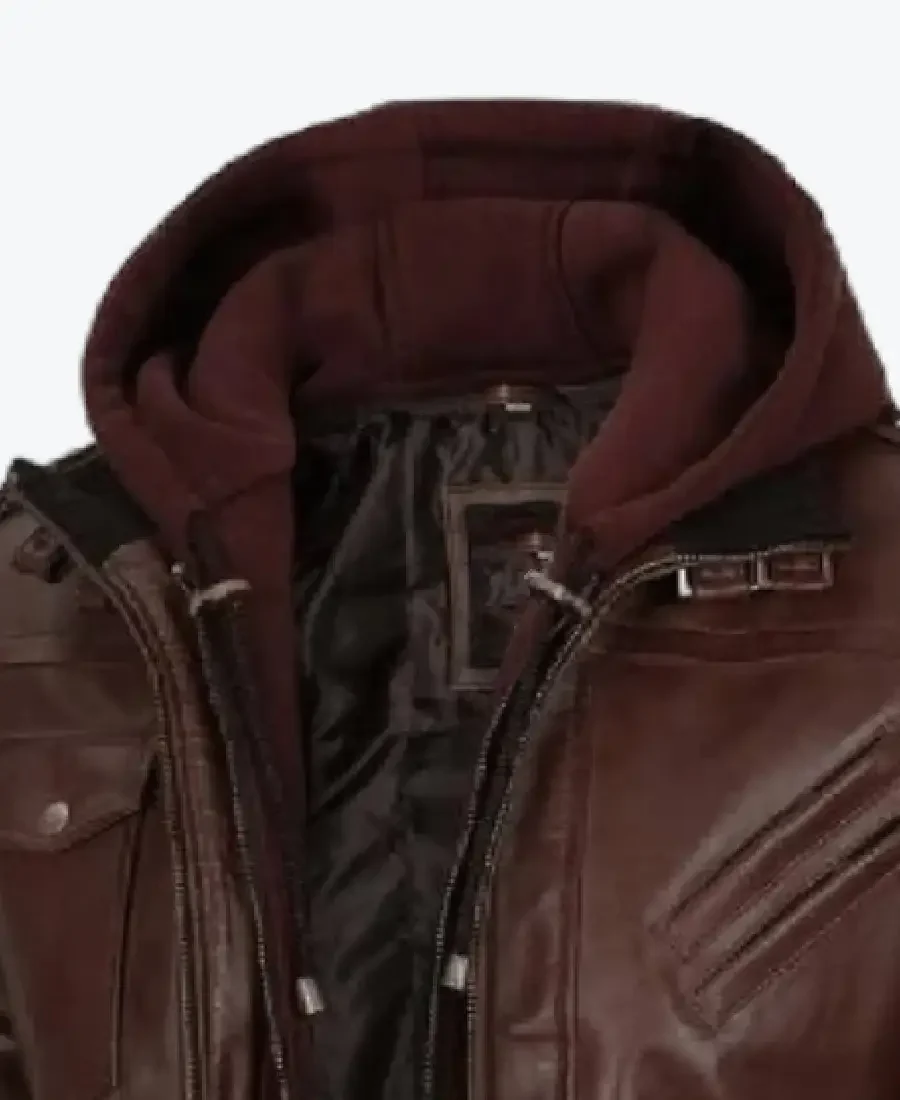 Mens Dark Brown Leather Bomber Jacket With Hood