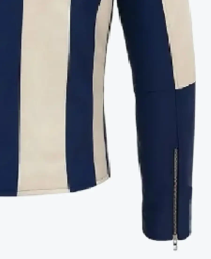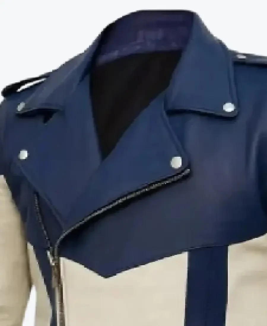 The architecture of this jacket is defined by its iconic asymmetrical lines and high-contrast geometric detailing. It features a bold lapel style collar with polished snap-down accents and military-inspired epaulets on the shoulders, lending a structured and powerful frame to the silhouette. The high-impact design is characterized by diamond-quilted padding on the shoulders and strategic vertical blue stripes that intersect the ivory torso, creating a bold, heroic visual. The front is anchored by a high-performance asymmetrical zipper closure, maintaining a precision slim-fit profile that highlights the jacket’s architectural lines. To ensure a custom fit and a tapered look at the wrists, the full-length sleeves are finished with high-performance zipper cuffs. Designed for the individual who demands standout utility, this Rare Jackets essential features a strategic two vertical side zip pocket configuration, offering secure storage while reinforcing the jacket’s powerful, high-fashion silhouette.