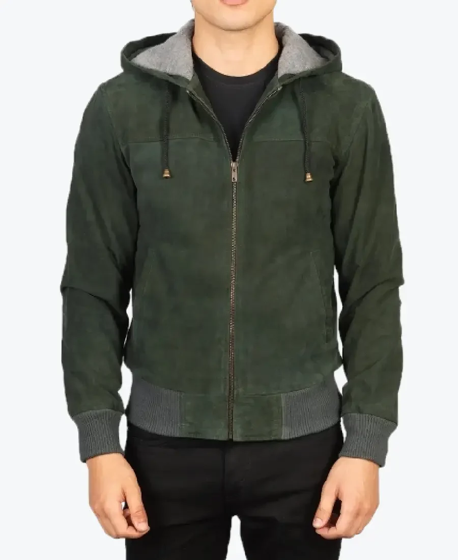 Men’s Green Hooded Suede Bomber Jacket