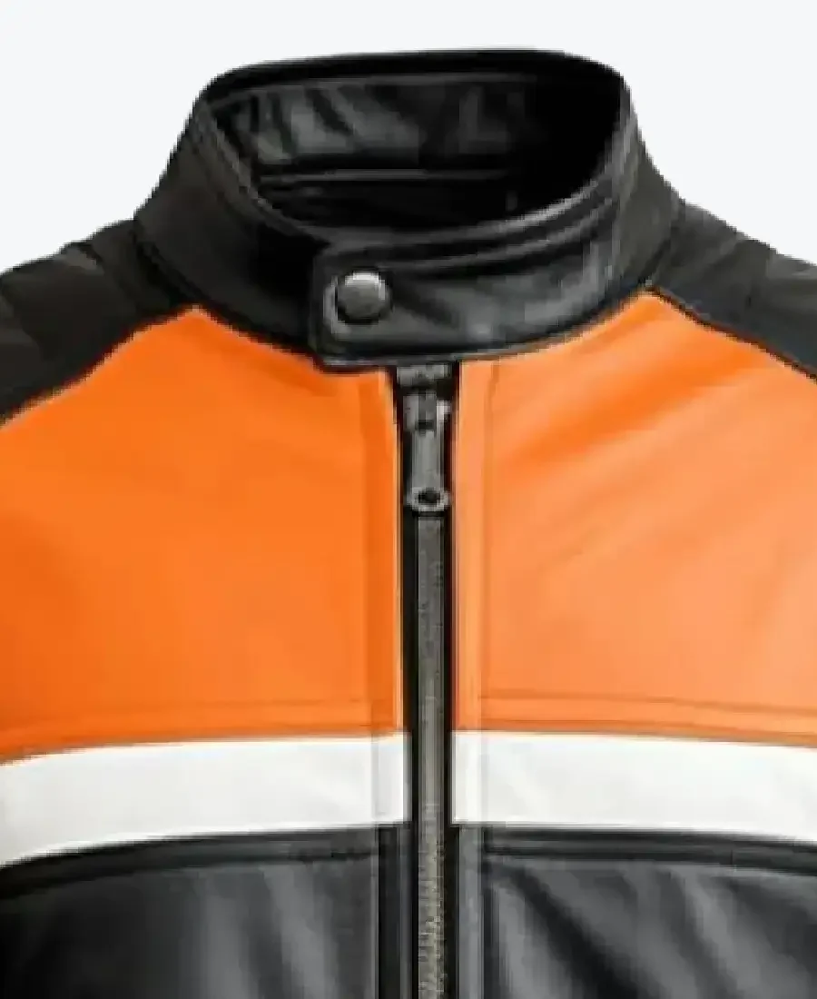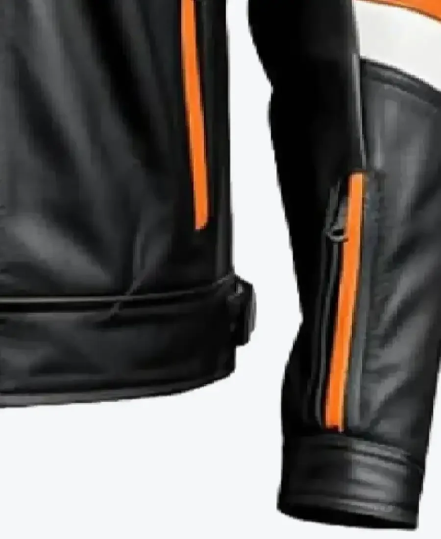 The architecture of this jacket is defined by its clean, aerodynamic lines and iconic quilted horizontal padding on the shoulders, lending a structured and powerful frame to the silhouette. It features a contemporary erect collar with a secure snap-tab closure, providing a streamlined frame to the neckline that exudes a classic racer aesthetic. The high-impact design is further enhanced by vibrant orange and white racing stripes that sweep across the chest and down the full length of the sleeves, creating a bold visual contrast. The front is anchored by a high-performance centered zipper closure, flanked by dual vertical side zip pockets that maintain a precision slim-fit. To ensure a custom fit and a tapered look at the wrists, the full-length sleeves are finished with high-performance zipper cuffs, complemented by adjustable buckled waist tabs for a personalized cinch. Designed for the individual who demands standout utility, this Rare Jackets essential features a strategic two vertical side zip pocket configuration, offering secure storage while reinforcing the jacket’s powerful, athletic silhouette.