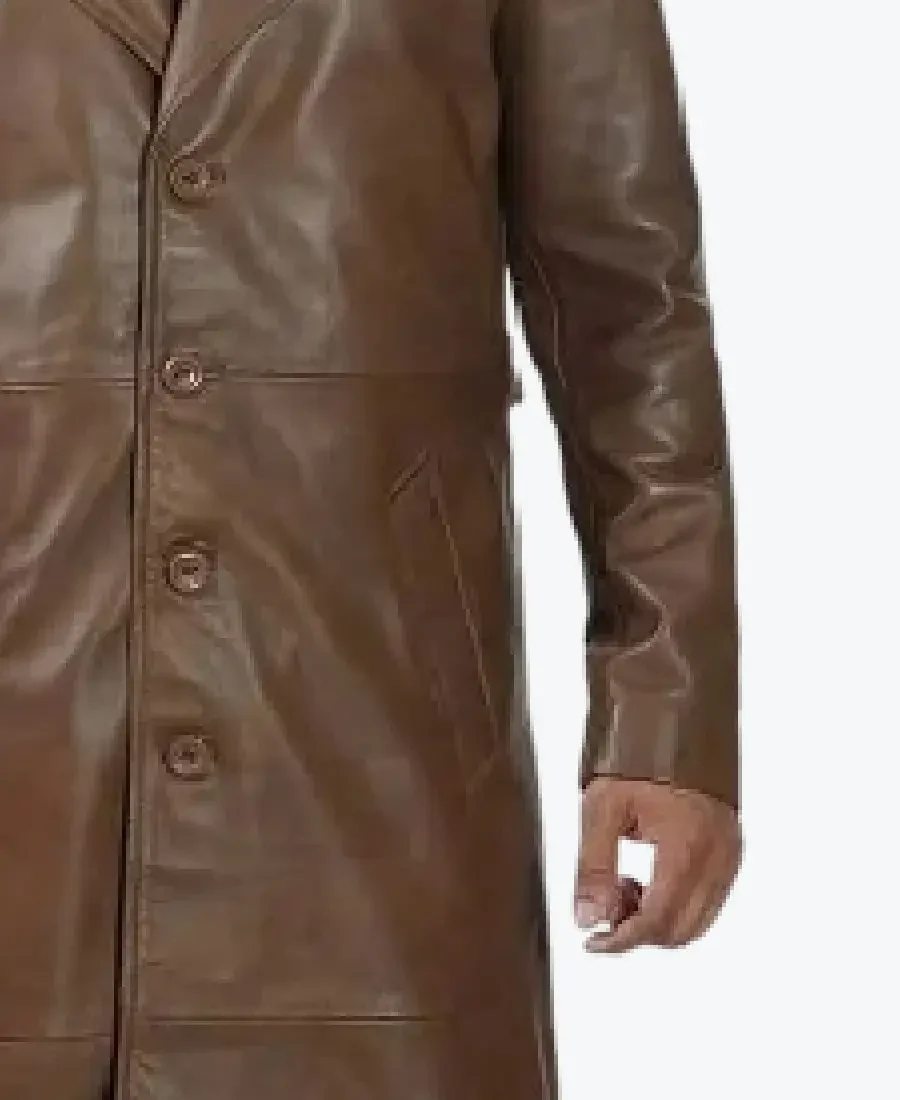 The Men’s Lapel Style Brown Long Coat by Rare Jackets is a masterclass in high-definition urban architecture and precision luxury meticulously handcrafted from premium cowhide leather or high-grade faux leather. Drenched in a commanding and timeless roasted chestnut amber, this piece leverages a robust high-grade grain and natural wind-resistant properties to provide a formidable protective shell for the modern landscape. The leather is selected for its industrial-grade durability and a sophisticated semi-gloss buttery finish, ensuring the coat maintains a sharp authoritative frame while projecting a raw, high-fashion energy. Inside, the garment is fully integrated with a silky viscose lining, providing a breathable and friction-free experience for maximum all-day comfort.