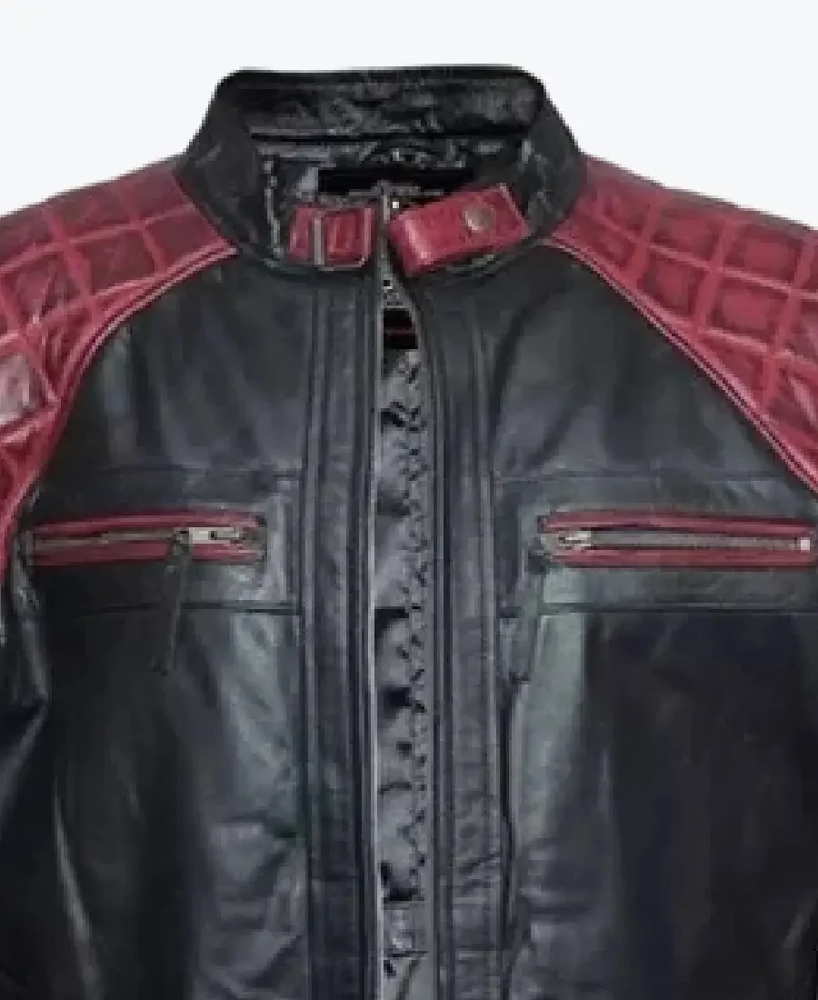 The Mens Quilted Black and Maroon Jacket by Rare Jackets is a masterclass in high velocity urban architecture and precision luxury meticulously handcrafted from premium authentic lambskin leather. Drenched in a commanding obsidian black paired with deep oxblood maroon shoulder accents, this piece leverages a robust high grade grain and natural wind resistant properties to provide a formidable protective shell for the modern landscape. The lambskin is selected for its industrial grade durability and a sophisticated semi gloss buttery finish, ensuring the jacket maintains a sharp authoritative frame while projecting a raw, high fashion energy. Inside, the garment is fully integrated with a silky viscose lining, providing a breathable and friction free experience for maximum all day comfort.