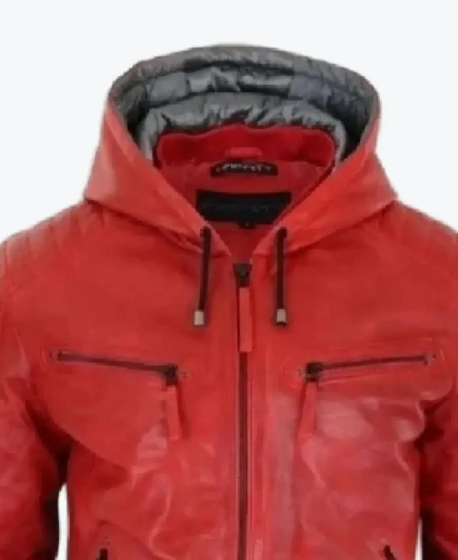 Mens Red Bomber Hooded Leather Jackets