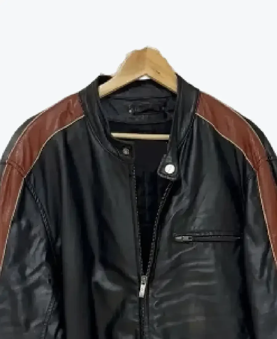 The architecture of this jacket is defined by its clean, aerodynamic lines and iconic color-block racing stripes. It features a contemporary erect collar with a secure snap-button closure, providing a streamlined frame to the neckline that exudes a classic cafe-racer aesthetic. The high-impact design is further enhanced by bold brown leather panels that sweep across the shoulders and run the full length of the sleeves, creating a refined visual contrast against the dark base. The front is anchored by a high-performance centered zipper closure, maintaining a precision regular fit profile that enhances the jacket’s powerful silhouette. To ensure a natural and relaxed drape at the wrists, the full-length sleeves are finished with clean open hem cuffs. Designed for the individual who demands practical utility, this Rare Jackets essential features a strategic three-pocket configuration, including two vertical side pockets and a horizontal chest zip pocket, offering secure storage while reinforcing the jacket’s powerful, athletic frame.