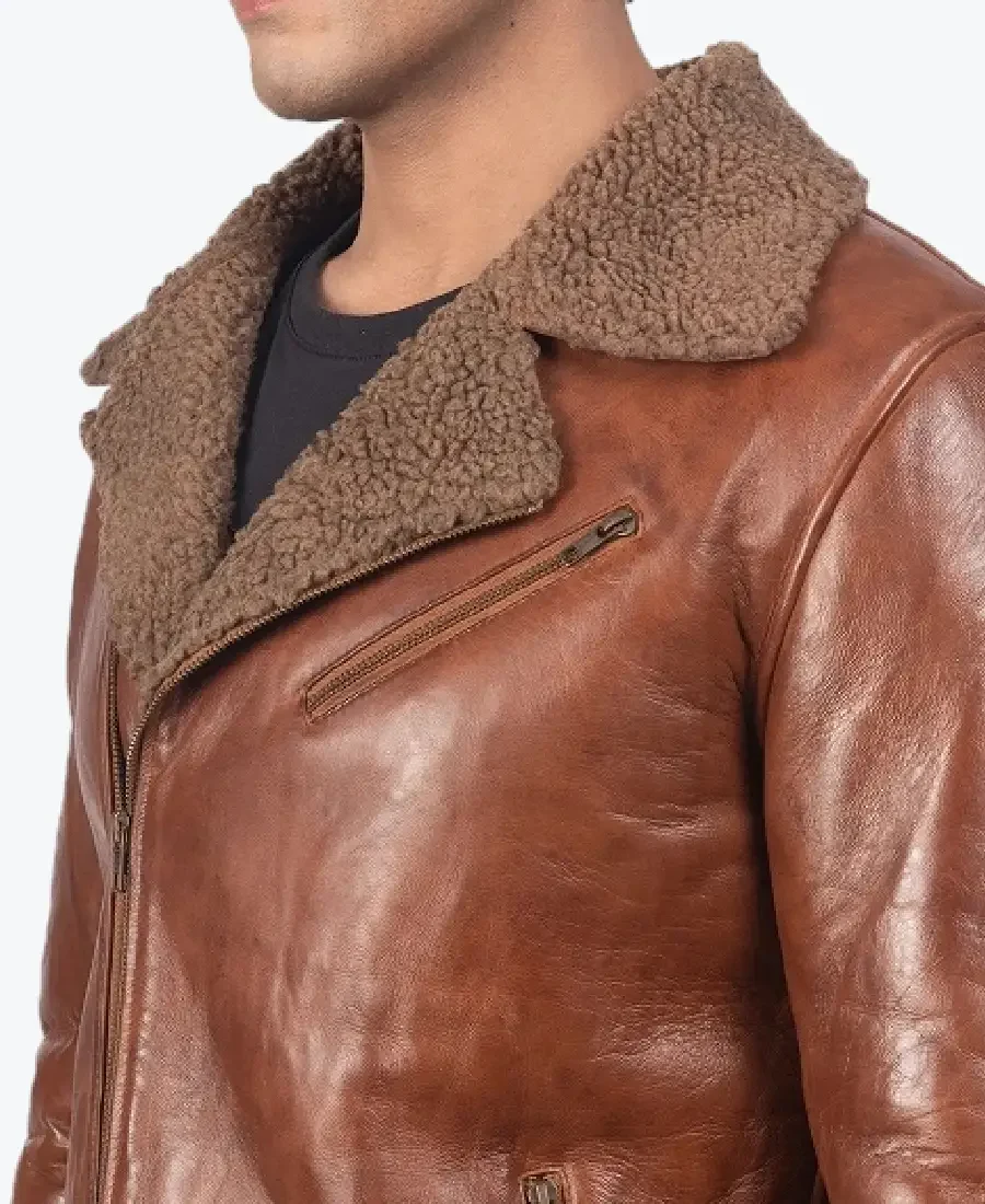 The Men’s Shearling Lapel Style Leather Jacket by Rare Jackets is a masterclass in rugged artisanal depth and precision urban luxury, meticulously handcrafted from premium cowhide leather (also available in high-grade faux leather). Drenched in a commanding and rich chestnut brown, this piece leverages a robust, heavy-grade grain and natural wind-resistant properties to provide a formidable protective shell. The hide is selected for its industrial-grade durability and a sophisticated, hand-burnished distressed finish, ensuring the jacket maintains a sharp, authoritative frame while projecting a raw, heritage energy. Inside, the garment is fully integrated with a plush, high-density mocha Sherpa lining, providing unparalleled warmth and a high-comfort experience for peak winter performance.