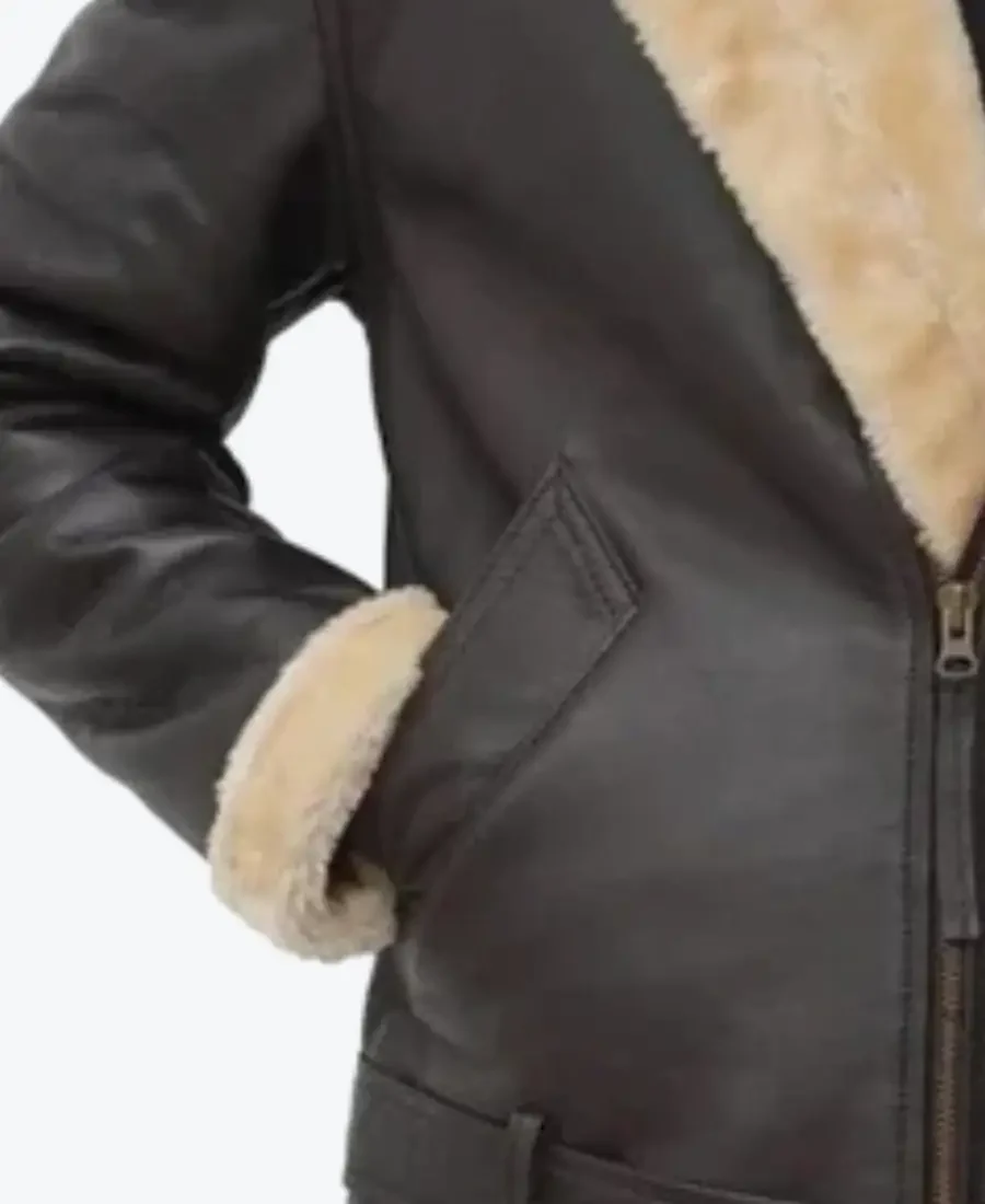 The architecture of this jacket is defined by its clean, aerodynamic lines and iconic exposed shearling trim. It features a bold, oversized fur-lined shirt style collar equipped with a secure buckle-tab throat latch, providing a textured and powerful frame to the neckline that exudes a classic military B3 aesthetic. The front is anchored by a high-performance centered zipper closure, complemented by a strategic full-waist belt with a polished bronze-tone buckle for an architectural cinch. To ensure maximum heat retention at the extremities, the full-length sleeves are finished with thick fur-trimmed open hem cuffs, complemented by a matching fur-trimmed hemline and reinforced horizontal stitching. Designed for the individual who demands standout utility within a legendary frame, this Rare Jackets essential features a strategic four-pocket configuration, including two angled side welt pockets and two hidden inner pockets, offering secure storage while reinforcing the jacket’s powerful, high-impact silhouette.