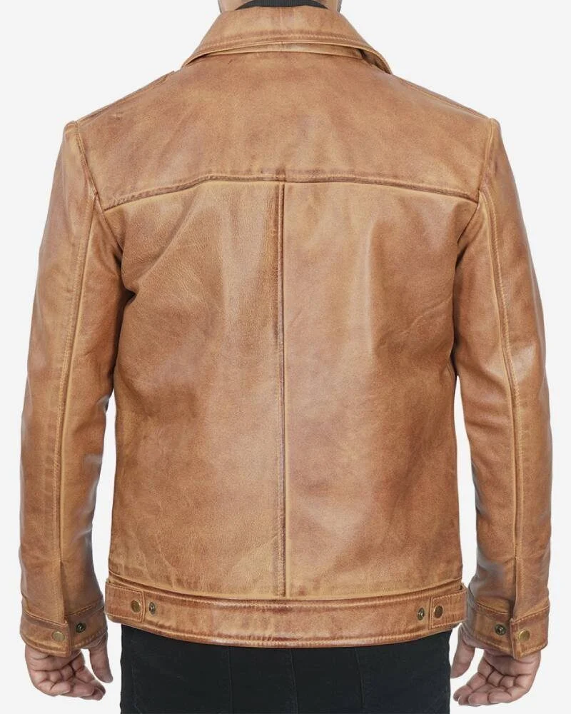 Men’s Shirt Collar Camel Waxed Leather Jacket