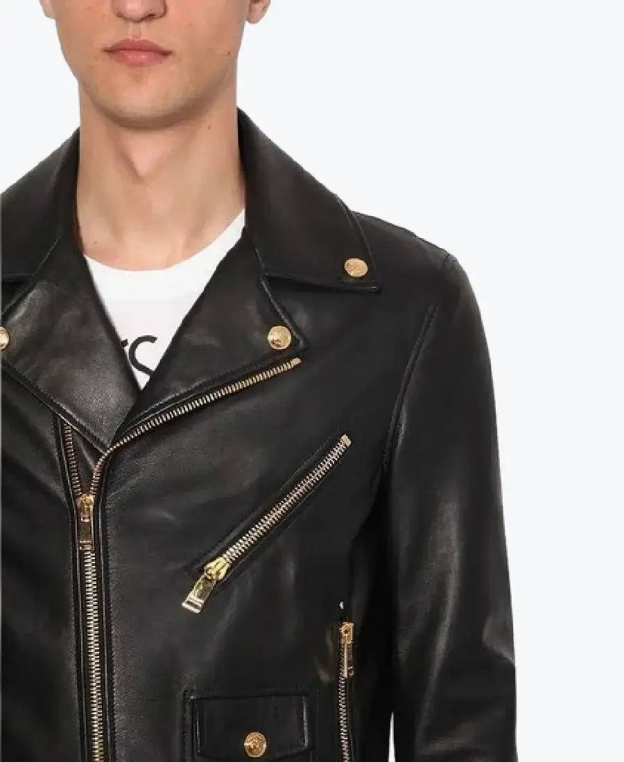 The architecture of this jacket is defined by its structured, asymmetric silhouette and an iconic metropolitan “regal-rebel” aesthetic. It features a sharp, oversized lapel style collar adorned with reinforced gold-tone snap-button hardware, providing a powerful frame to the neckline that exudes a classic professional vibe with a contemporary urban twist. The front is anchored by a high-impact, asymmetric golden zipper closure, maintaining a precision tailored fit profile that emphasizes the luxurious gold-on-black contrast and expert anatomical seam detailing. To ensure a custom look and tapered profile at the extremities, the full-length sleeves are finished with high-performance golden zipper cuffs, while the waist is defined by an integrated buckled leather belt that creates a sophisticated architectural volume. Designed for the individual who demands maximum organized utility within a polished frame, this Rare Jackets essential features a strategic six-pocket configuration including a technical slanted chest zipper pocket, two discreet side entry zipper pockets, a classic snap-flap utility pocket, and two hidden inner pockets—offering secure storage while reinforcing the jacket’s sleek, high-impact silhouette.