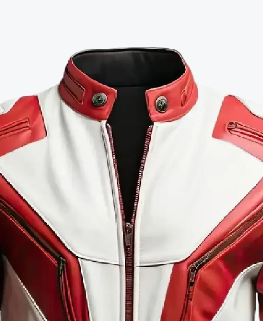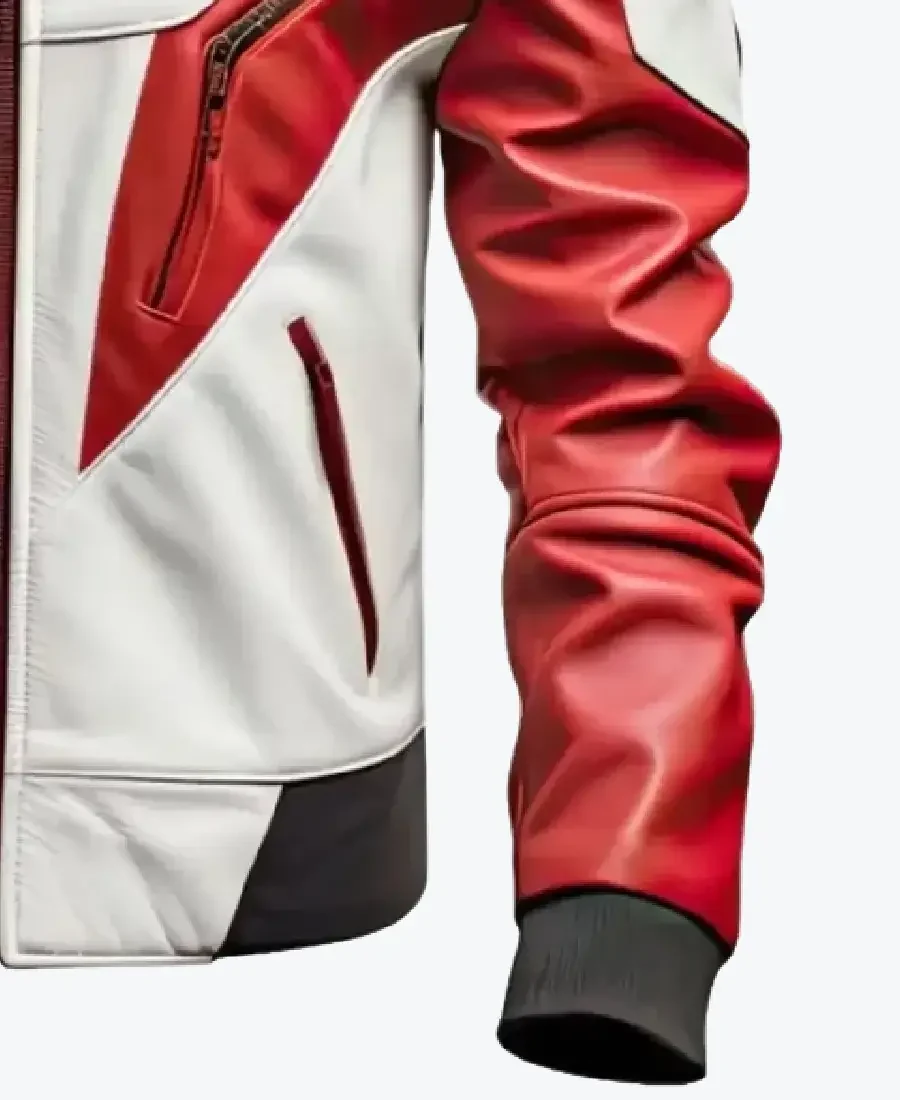 The architecture of this jacket is defined by its clean, aerodynamic lines and iconic quilted horizontal padding on the shoulders and upper arms, lending a structured and powerful frame to the silhouette. It features a contemporary short neck collar with dual polished snap-button closures, providing a streamlined frame to the neckline that exudes a classic street-racer aesthetic. The high-impact design is further enhanced by asymmetrical red angular panels that sweep across the chest and down the sleeves, creating a bold visual contrast against the white base. The front is anchored by a high-performance centered zipper closure, flanked by dual vertical side zip pockets that maintain a precision slim-fit. To ensure a custom fit and maximum heat retention, the full-length sleeves and waistline are finished with high-performance ribbed cuffs. Designed for the individual who demands standout utility, this Rare Jackets essential features a strategic four-pocket configuration, including two vertical side pockets and two hidden inner pockets, offering secure storage while reinforcing the jacket’s powerful, athletic silhouette.