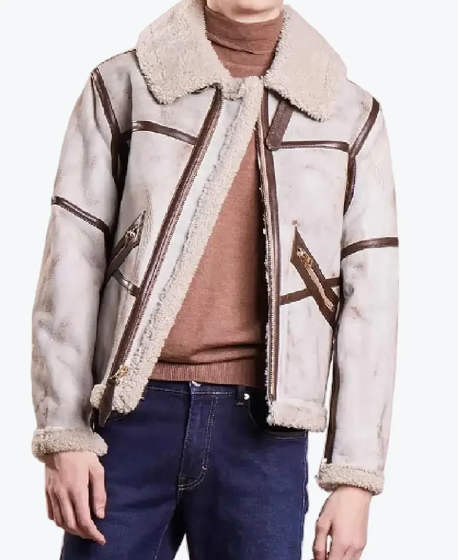 The architecture of this jacket is defined by its clean waist-length lines and an iconic B-3 inspired aesthetic with a modern artistic twist. It features a bold oversized wide fur collar providing a textured and powerful frame to the neckline that offers superior soft-touch protection against freezing gusts. The front is anchored by a high-performance heavy-duty brass zipper closure maintaining a precision tailored fit profile. To ensure maximum heat retention and a custom fit at the extremities the full-length sleeves and hemline are finished with thick exposed fur cuffs complemented by sophisticated dark brown leather piping and diagonal paneling that adds structural depth to the silhouette. Designed for the individual who demands maximum organized utility within a high-impact frame this Rare Jackets essential features a strategic four-pocket configuration—including two distinctive diagonal waist zipper pockets and two hidden inner pockets—offering secure storage while reinforcing the jacket’s sleek tactical silhouette.
