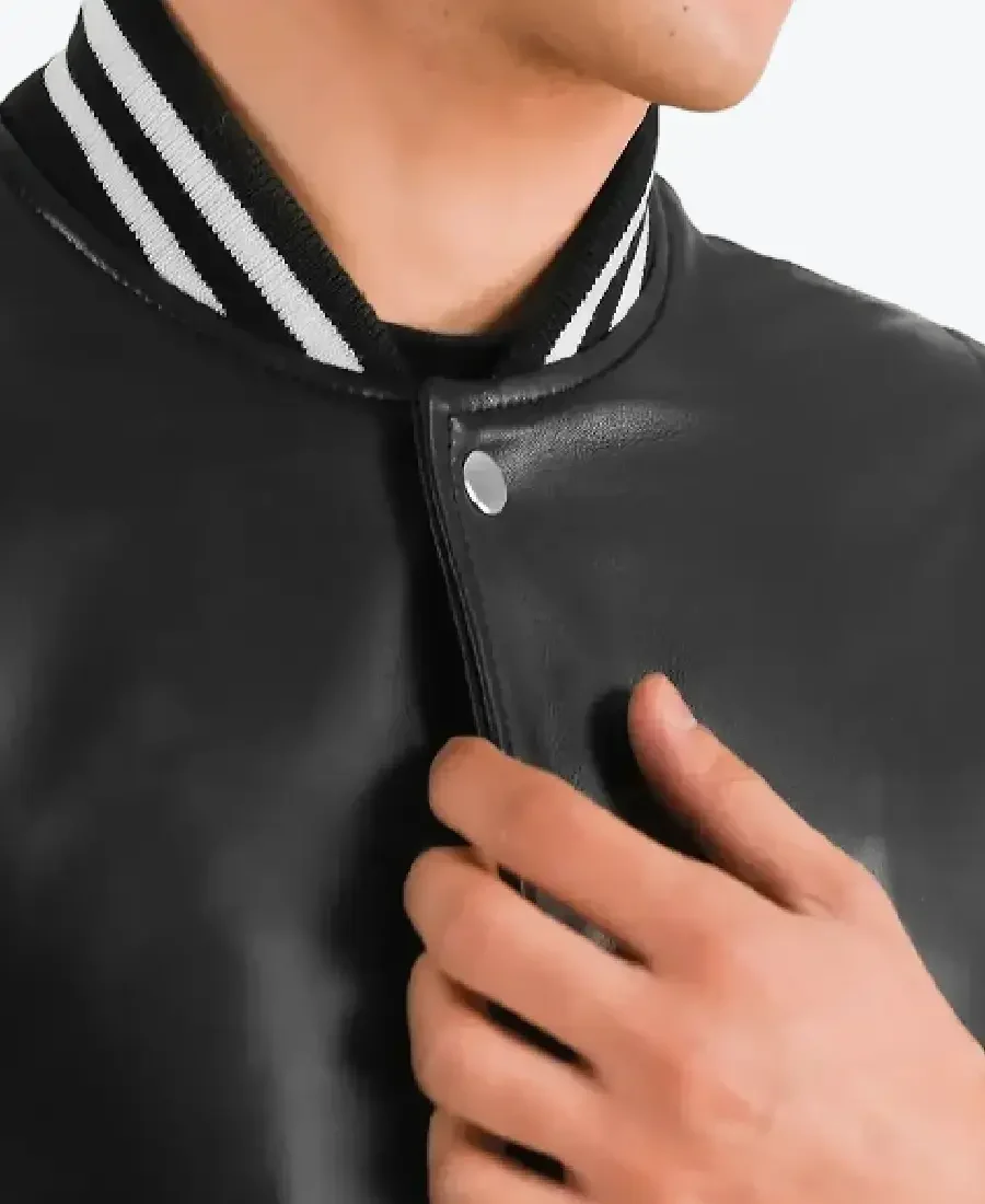Shop The Rare Jackets Black Leather Varsity Jacket with Ribbed Trims