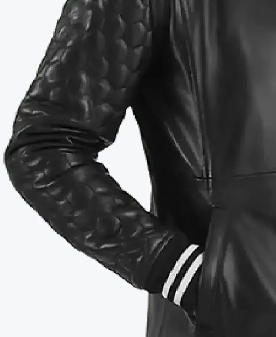 The architecture of this jacket is defined by its unique extended knee-length silhouette, blending the athletic heritage of a varsity jacket with the dramatic presence of a trench coat. It features a contemporary ribbed stand-up collar and matching ribbed cuffs with signature white striped accents, lending a structured yet sporty frame to the design. The front is anchored by a high-performance snap-button closure, maintaining a precision slim-fit profile that enhances the coat’s powerful, elongated aesthetic. To ensure a custom textural impact, the full-length sleeves feature an intricate quilted diamond pattern, providing a high-fashion contrast to the smooth leather torso. Designed for the individual who demands standout utility within a bold, retro-modern frame, this Rare Jackets essential features a strategic two side pocket configuration, offering secure storage while reinforcing the coat’s powerful, architectural silhouette.
