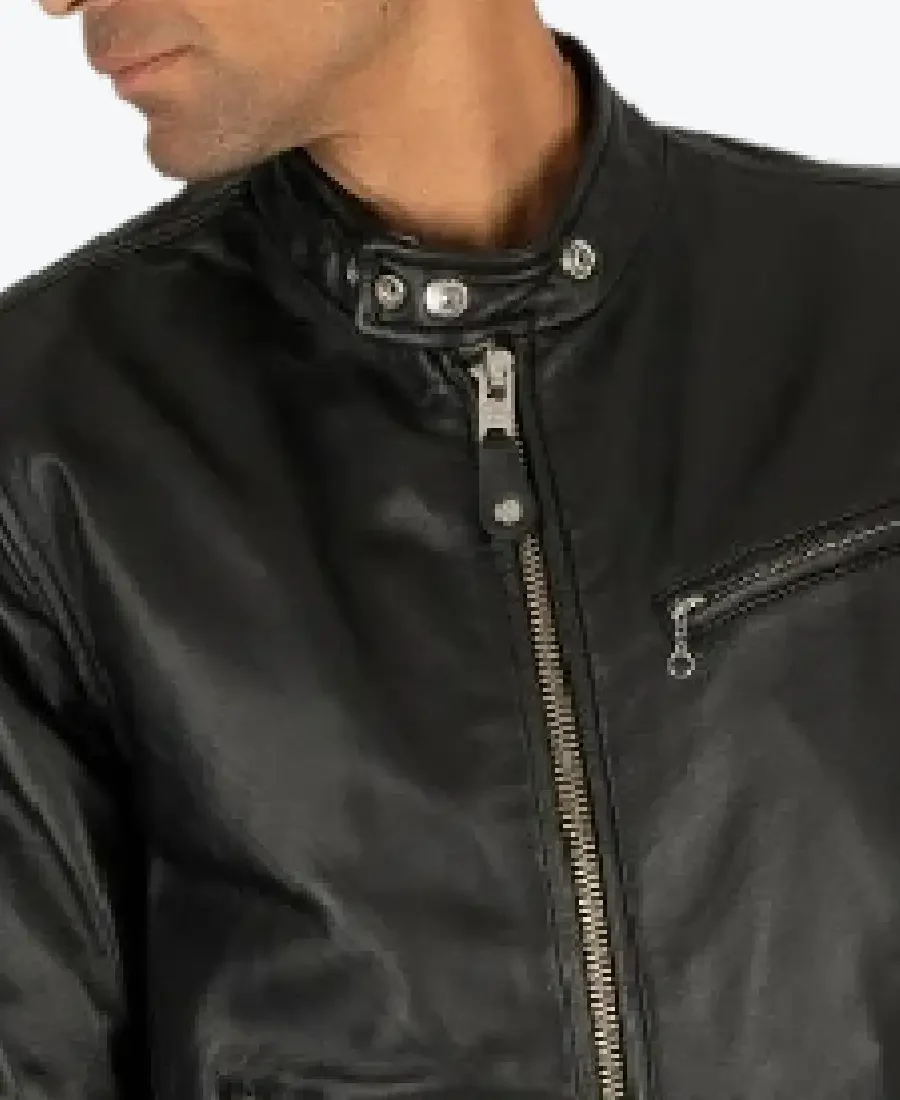 The architecture of this jacket is defined by its clean, aerodynamic lines and a sophisticated slim-fit silhouette. It features a contemporary erect collar with a polished snap-tab closure, providing a streamlined and secure frame to the neckline that exudes a bold, cafe-racer aesthetic. The front is anchored by a high-performance zipper closure, maintaining a precision profile that transitions seamlessly from open-road adventures to high-fashion social settings. To ensure a natural and relaxed drape at the wrists, the full-length sleeves are finished with clean open hem cuffs, allowing for effortless movement and effortless layering. Designed for the individual who demands organized utility within a sleek frame, this Rare Jackets essential features a strategic four-pocket configuration, including three front zip pockets (featuring a signature slanted chest zip and two vertical side pockets) and one hidden inner pocket, offering secure storage while reinforcing the jacket’s powerful, architectural silhouette.