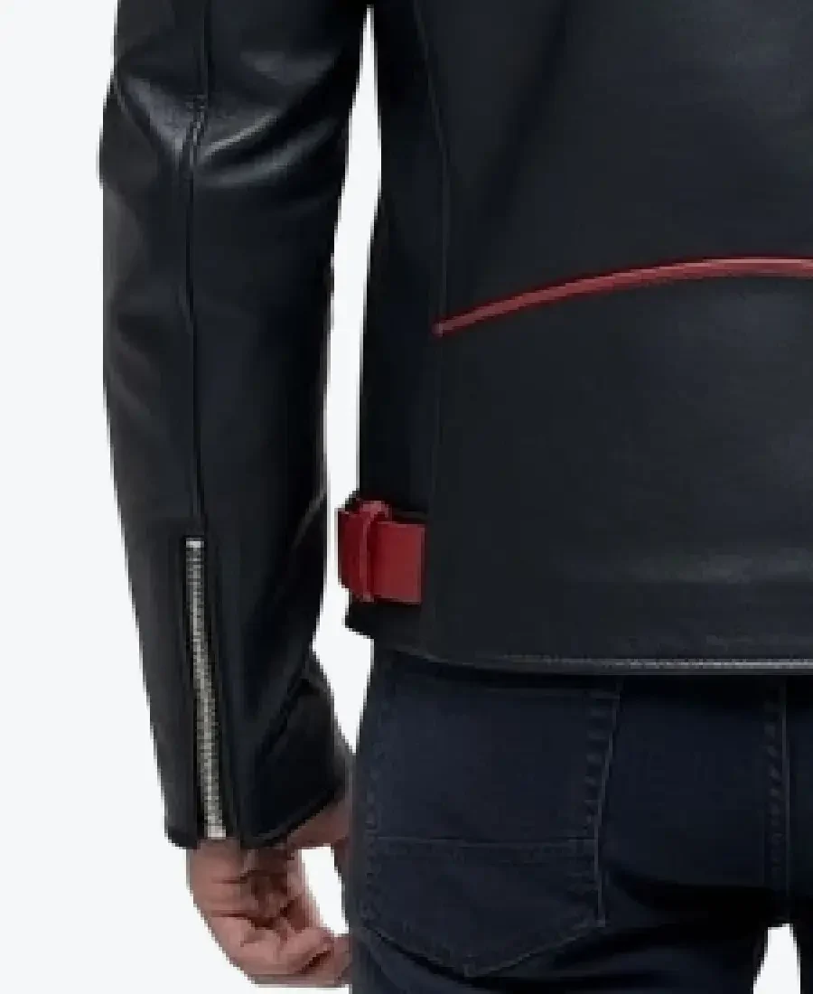 The architecture of this jacket is defined by its structured, asymmetric silhouette and an iconic metropolitan “punk-elite” aesthetic. It features sharp, oversized lapel style collars in vibrant crimson leather, meticulously detailed with industrial silver micro-studs and reinforced snap-button hardware, providing a powerful frame to the neckline that exudes a classic professional vibe with a contemporary urban twist. The front is anchored by a high-performance asymmetric silver zipper closure, maintaining a precision tailored fit profile that emphasizes the unique red-and-black dual-tone construction and expert anatomical seam detailing. To ensure a custom look and tapered profile at the extremities, the full-length sleeves are finished with clean open hem cuffs, while the waist is secured by a striking integrated buckled leather belt with crimson belt loops that creates a sophisticated architectural volume. Designed for the individual who demands maximum artistic flair within a polished frame, this Rare Jackets essential features a strategic pocket configuration including two technical vertical side entry zipper pockets, a classic snap-flap crimson coin pocket, and two hidden inner pockets—offering secure storage while reinforcing the jacket’s sleek, high-impact silhouette.