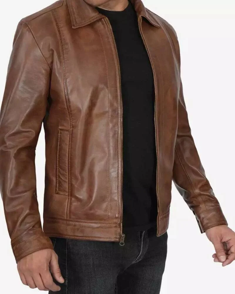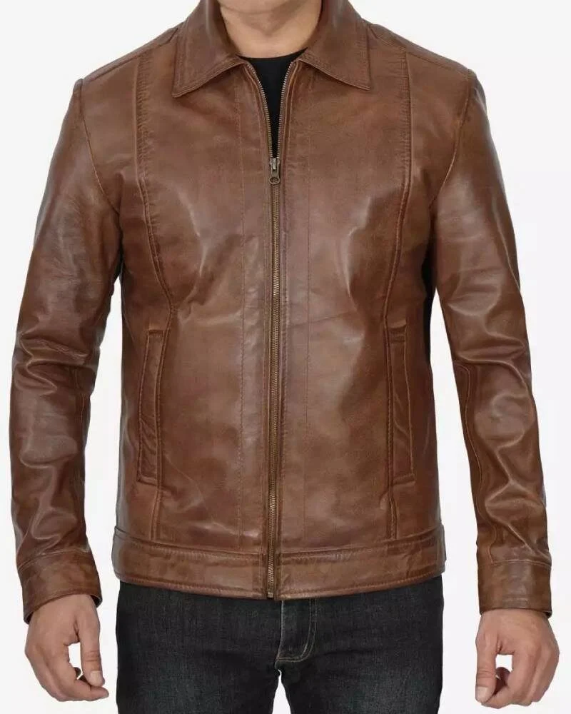 Reeves Mens Shirt Collar Chocolate Brown Leather Jacket