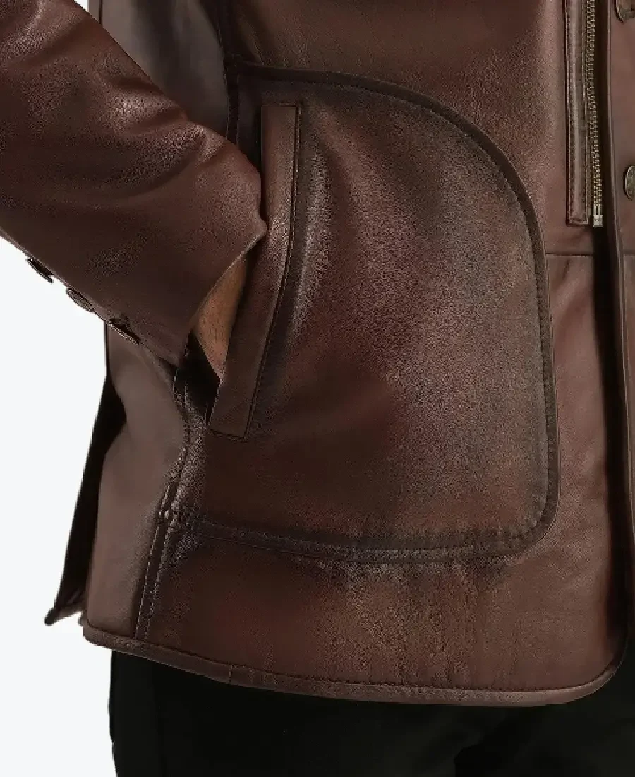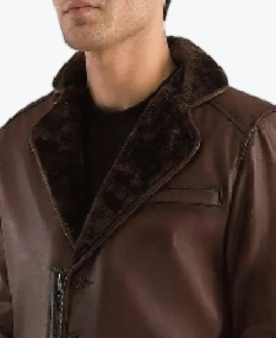 The architecture of this coat is defined by its clean hip length lines and iconic sherpa style aesthetic. It features a contemporary notch lapel style collar fully lined with matching dark brown faux fur providing a textured and powerful frame to the neckline that offers superior protection against cold gusts. The front is anchored by a high performance three button closure maintaining a precision relaxed fit profile that allows for effortless layering. To ensure a natural and streamlined drape at the wrists the full length sleeves are finished with clean open hem cuffs while the exterior is detailed with unique curved patch pockets featuring subtle decorative stitching. Designed for the individual who demands maximum presence within a polished frame this Rare Jackets essential features a strategic four pocket configuration including two side patch pockets and two hidden inner pockets offering secure storage while reinforcing the coat’s sleek high impact silhouette.