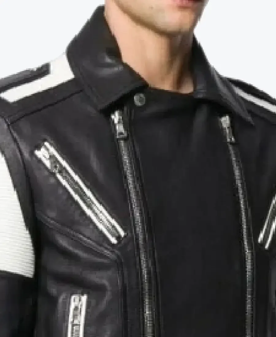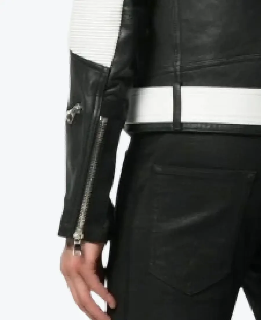 The architecture of this jacket is defined by its structured, asymmetric silhouette and an iconic metropolitan “motocross-elite” aesthetic. It features a sharp, tailored shirt style collar that provides a structured and powerful frame to the neckline, exuding a classic professional vibe with a contemporary urban twist. The front is anchored by a high-impact, multi-zipper system including a central asymmetric silver zipper closure, maintaining a precision tailored fit profile that emphasizes the unique alternating black and white striped sleeve construction and expert anatomical seam detailing. To ensure a custom look and tapered profile at the extremities, the full-length sleeves are finished with high-performance silver zipper cuffs, while the waist is secured by a striking arctic white buckled leather belt that creates a sophisticated architectural volume. Designed for the individual who demands maximum organized utility within a polished frame, this Rare Jackets essential features a strategic pocket configuration including four technical exterior zipper pockets—offering secure storage while reinforcing the jacket’s sleek, high-impact silhouette.