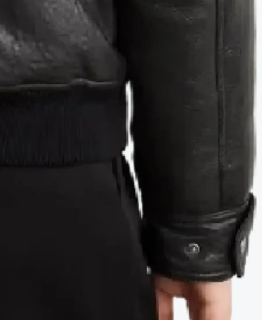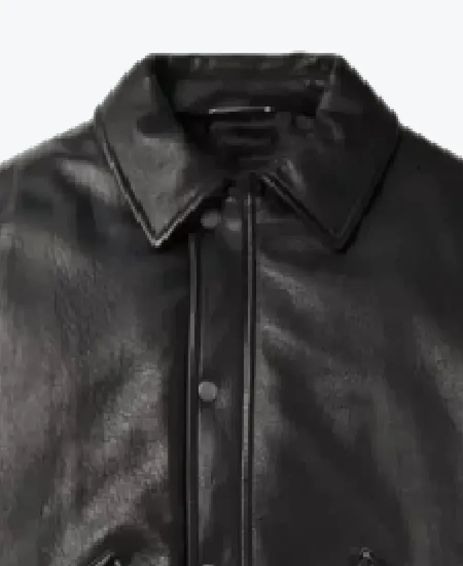 The architecture of this jacket is defined by its structured, voluminous silhouette and an iconic metropolitan “high-fashion-bomber” aesthetic. It features a sharp turn-down shirt style leather collar providing a powerful frame to the neckline that exudes a classic professional vibe with a contemporary urban twist. The front is anchored by a high-performance central snap-button closure system with reinforced tonal hardware, maintaining a precision tailored fit profile that emphasizes the clean-front construction and expert anatomical seam detailing. To ensure a custom look and secure profile at the extremities, the full-length sleeves are finished with clean button cuffs, while the reinforced waist is finished with a high-impact charcoal rib-knitted band to create a sophisticated architectural volume. Designed for the individual who demands maximum organized utility within a polished frame, this Rare Jackets essential features a strategic pocket configuration including two expansive slanted snap-flap waist pockets and a hidden inner pocket—offering secure storage while reinforcing the jacket’s sleek, high-impact silhouette.