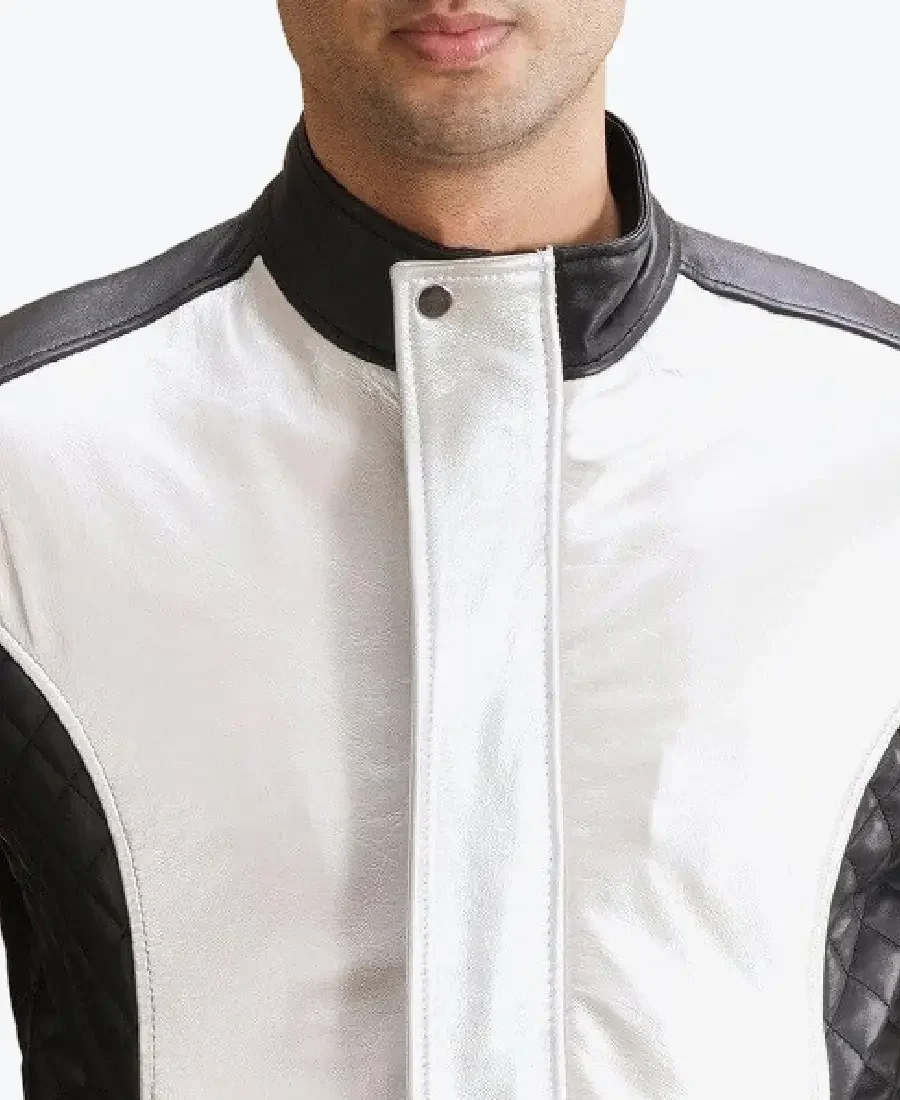The architecture of this jacket is defined by its clean waist-length silhouette and an iconic “graphic-moto” aesthetic. It features a sharp band-style collar with a secure snap-button closure, providing a structured and powerful frame to the neckline that exudes a classic professional vibe with a contemporary urban twist. The front is anchored by a high-performance central zipper concealed behind a sophisticated white leather storm flap with snap-button accents, maintaining a precision tailored-fit profile that emphasizes the unique star-like “spade” chest panelling. To ensure superior heat retention and a custom look at the extremities, the full-length sleeves and wide-waist hemline are finished with high-impact obsidian rib-knitted cuffs and a matching waistband, while the intricate diamond-quilted side panelling creates a sophisticated architectural volume. Designed for the individual who demands maximum artistic flair within a polished frame, this Rare Jackets essential features a strategic four-pocket configuration—including two discreet side-entry pockets and two hidden inner pockets—offering secure storage while reinforcing the jacket’s sleek, high-impact silhouette.