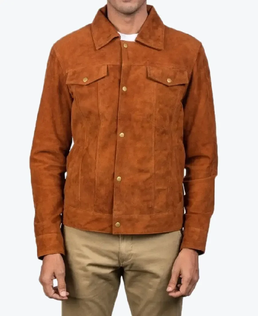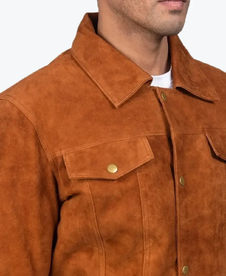 The Stallon Brown Suede Trucker Jacket by Rare Jackets is a masterclass in rugged heritage architecture and precision luxury meticulously handcrafted from premium authentic suede leather. Drenched in a commanding and warm burnt sienna tobacco, this piece leverages a robust high-grade nap and natural wind-resistant properties to provide a formidable protective shell for the modern landscape. The suede is selected for its industrial-grade durability and a sophisticated velvet matte finish, ensuring the jacket maintains a sharp authoritative frame while projecting a raw, high-fashion energy. Inside, the garment is fully integrated with a silky viscose lining, providing a breathable and friction-free experience for maximum all-day comfort.