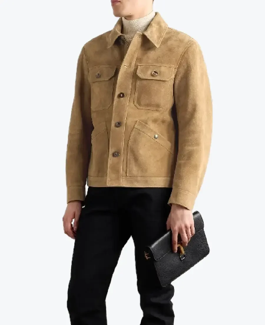 The Tom Ford Heathered Suede Leather Jacket by Rare Jackets is a masterclass in high definition urban architecture and precision luxury meticulously handcrafted from premium suede leather. Drenched in a commanding and timeless heathered desert tan, this piece leverages a robust high grade grain and natural wind resistant properties to provide a formidable protective shell for the most extreme landscapes. The leather is selected for its industrial grade durability and a sophisticated velvet soft finish, ensuring the jacket maintains a sharp authoritative frame while projecting a raw, high fashion energy. Inside, the garment is fully integrated with a smooth, high density viscose lining, providing a breathable and friction free experience for maximum all day movement and comfort.