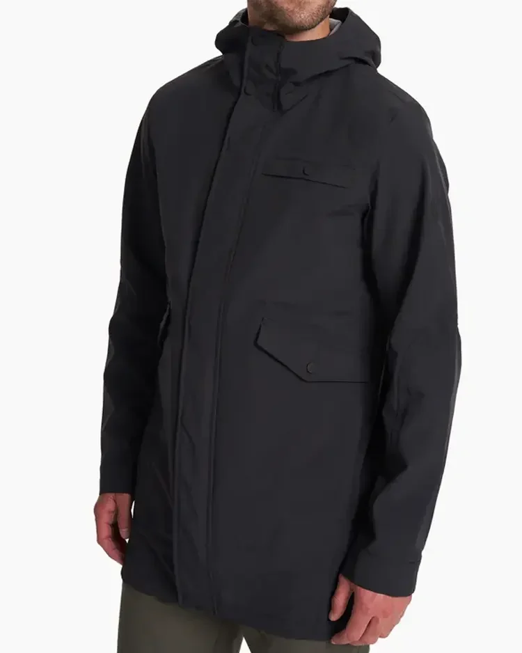 The silhouette is optimized for total weather defense, featuring a full-length cut and a dual-closure system that combines a heavy-duty zipper with a reinforced button storm flap to seal out wind and moisture. The integrated hood comes equipped with an adjustable drawcord, allowing for a personalized, secure fit during heavy downpours. Storage is prioritized through a functional three-pocket exterior layout, including two deep waist pockets and a quick-access chest pocket for your mobile device. Whether you’re navigating a coastal storm or a city commute, this Rare Jackets essential provides the technical resilience of outdoor gear with the refined aesthetic of urban outerwear.
