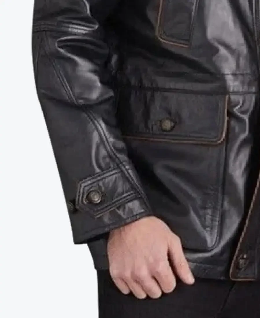 The architecture of this jacket is defined by its structured, long-line silhouette and an iconic metropolitan “explorer-utility” aesthetic. It features a sharp turn-down shirt style leather collar in a striking cognac brown, providing a powerful frame to the neckline that exudes a classic professional vibe with a contemporary urban twist. The front is anchored by a high-performance dual closure system—incorporating a central zipper shielded by a sleek protective storm flap with reinforced brass-tone buttons—maintaining a precision tailored fit profile that is further emphasized by an internal cinchable drawstring waist for an anatomical silhouette. To ensure a custom look at the extremities, the full-length sleeves are finished with clean open hem cuffs featuring adjustable button-tab detailing, while the reinforced vertical panelling creates a sophisticated architectural volume. Designed for the individual who demands maximum organized utility within a polished frame, this Rare Jackets essential features a strategic pocket configuration including two expansive snap-flap waist pockets, two discreet vertical chest welt pockets, and a hidden inner pocket—offering secure storage while reinforcing the jacket’s sleek, high-impact silhouette.