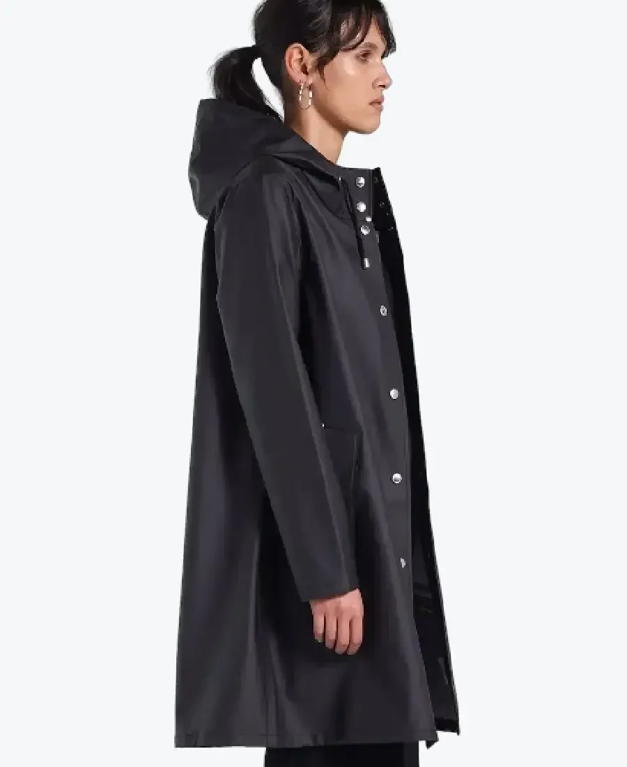 The architecture of this coat is defined by its clean mid-thigh longline silhouette and a minimalist tech-wear aesthetic. It features a contemporary adjustable hood with high-impact drawstrings, providing a structured and powerful frame to the neckline that offers superior protection against sudden downpours. The front is anchored by a high-performance snap-button closure, maintaining a precision tailored fit profile that allows for effortless layering over all-black ensembles or casual professional attire. To ensure a natural and streamlined drape at the extremities, the full-length sleeves are finished with clean open hem cuffs, while the lightweight tailoring creates a sophisticated architectural silhouette that moves with the body. Designed for the individual who demands maximum organized utility within a polished frame, this Rare Jackets essential features a strategic pocket configuration including two side-entry pockets for secure storage while reinforcing the coat’s sleek, high-impact silhouette.