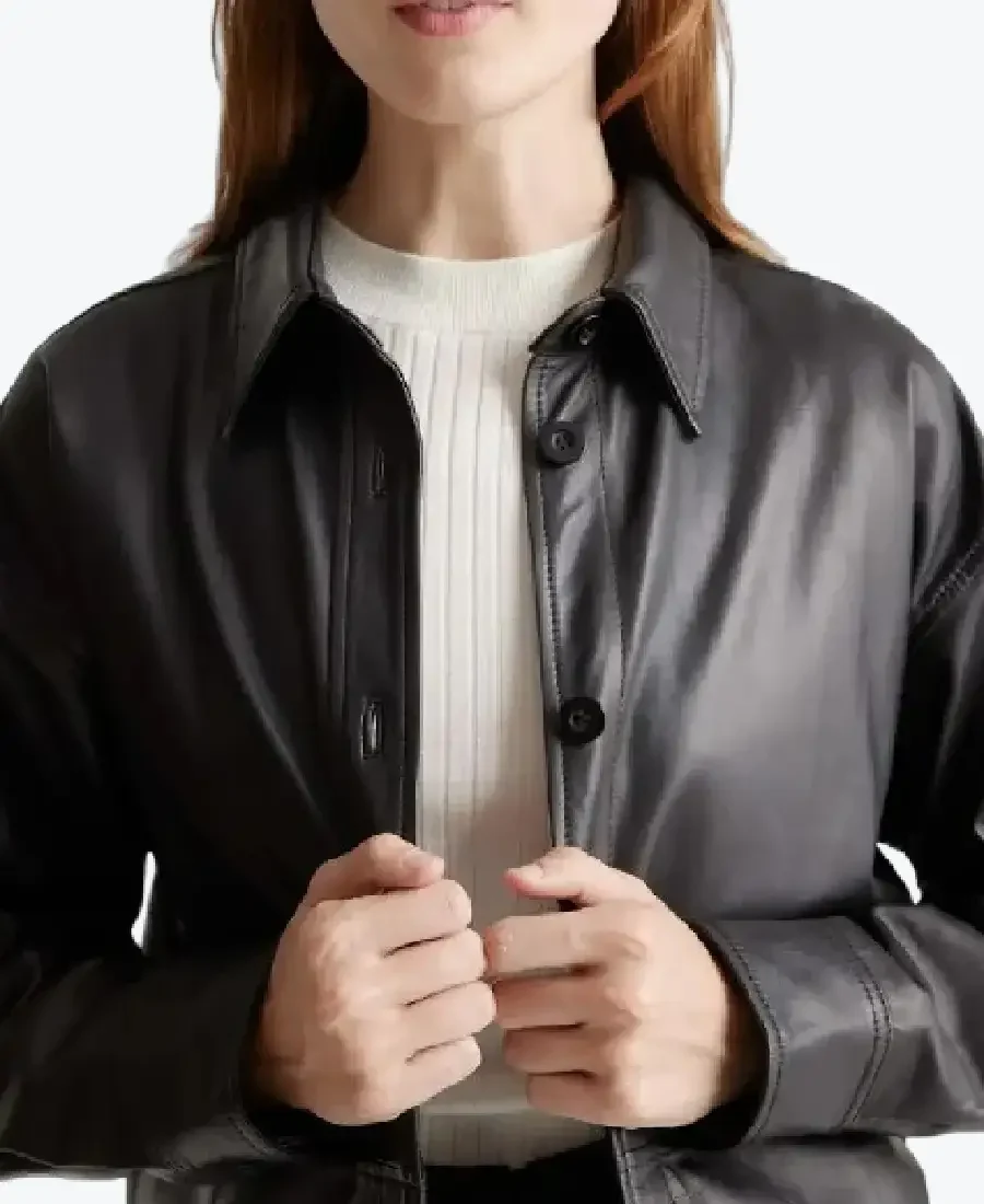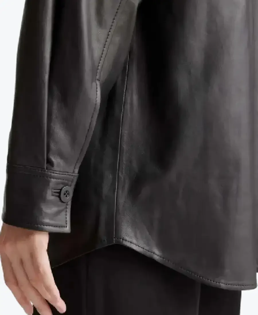 The architecture of this jacket is defined by its clean extended-length silhouette and an iconic “shacket” aesthetic. It features a sharp shirt-style leather collar providing a structured and powerful frame to the neckline that exudes a classic professional vibe with a dramatic modern twist. The front is anchored by a high-impact vertical placket featuring precision tonal button hardware, maintaining a precision tailored-fit profile that allows for effortless layering over white ribbed knits or monochromatic separates. To ensure a custom look and a streamlined drape at the extremities, the full-length sleeves are finished with clean button cuffs, while the expert oversized paneling throughout the torso creates a sophisticated architectural volume. Designed for the individual who demands maximum organized utility within a polished frame, this Rare Jackets essential features a strategic pocket configuration including two discreet side-entry pockets offering secure storage while reinforcing the jacket’s sleek, high-impact silhouette.