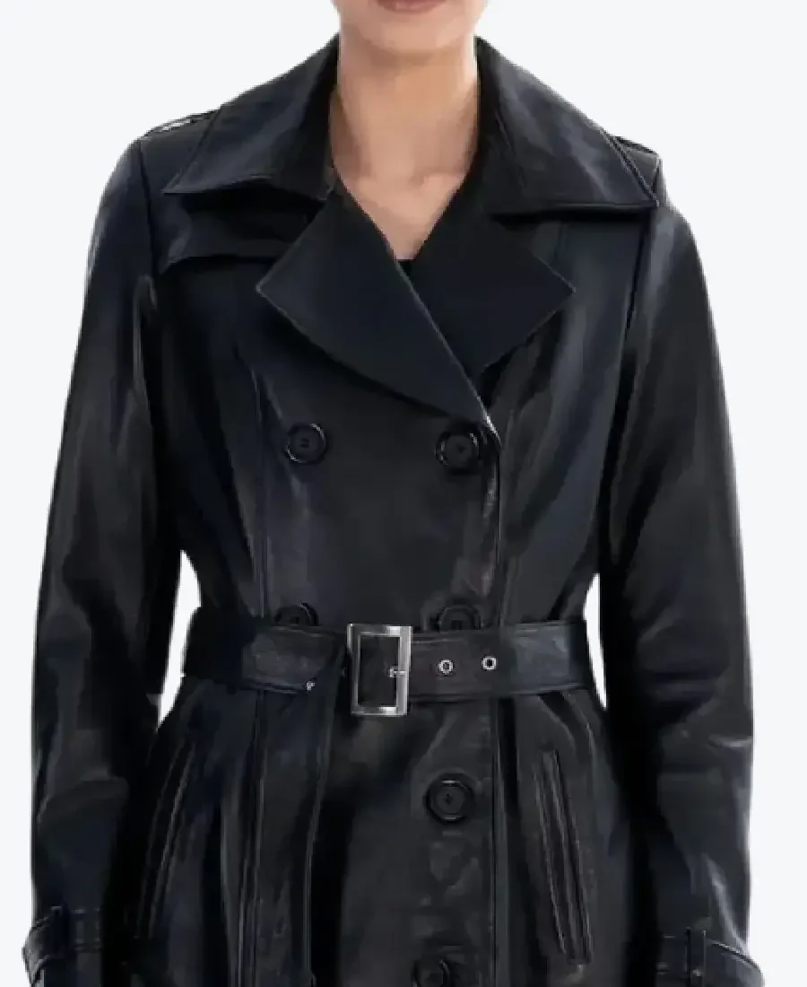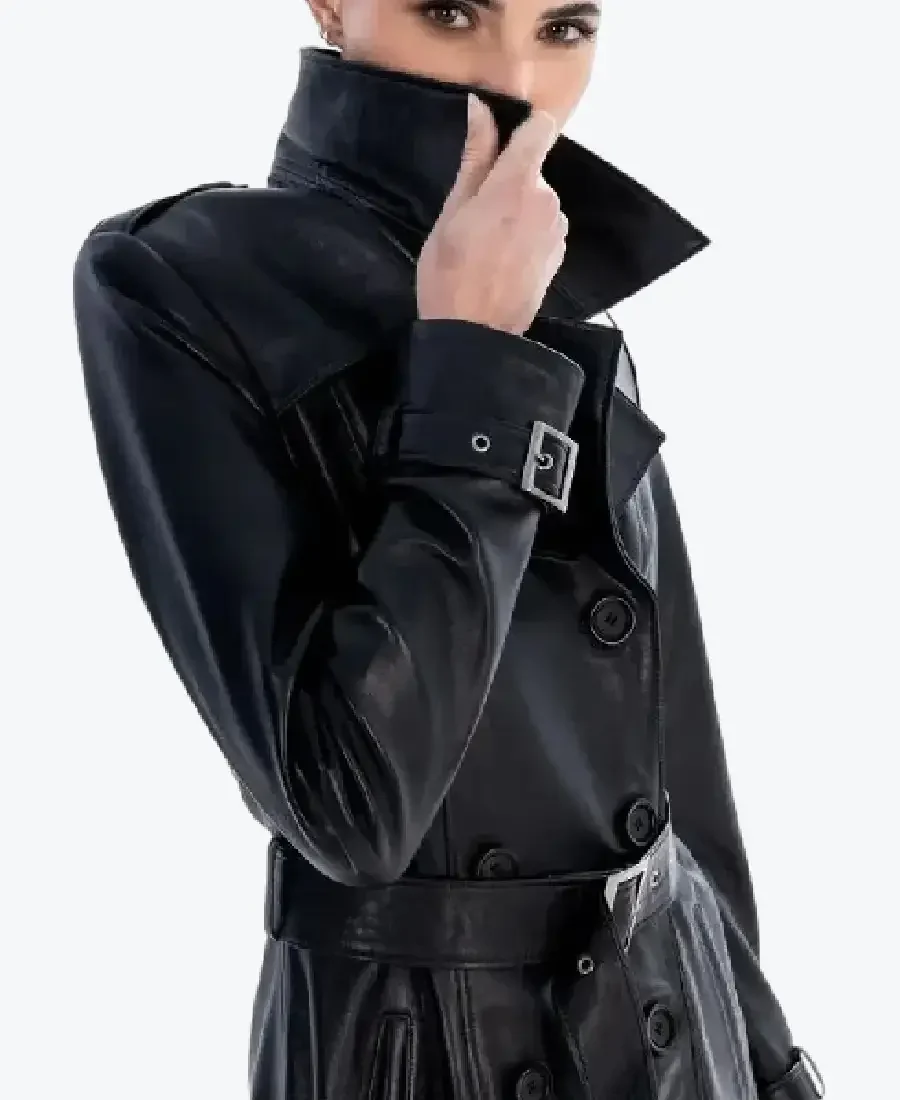The architecture of this coat is defined by its clean, floor-length lines and iconic double-breasted trench aesthetic. It features a contemporary lapel style collar, providing a powerful and tailored frame to the neckline that exudes a classic professional-meets-couture vibe. The front is anchored by a high-performance button closure, complemented by a strategic matching waist belt with a polished silver-tone buckle for an architectural cinch that defines the silhouette. To ensure a custom fit at the extremities, the full-length sleeves are finished with sophisticated belted cuffs, complemented by precise horizontal paneled stitching near the hemline that adds structural depth. Designed for the individual who demands maximum presence within a polished frame, this Rare Jackets essential features a strategic two vertical side welt pocket configuration, offering secure storage while reinforcing the coat’s sleek, high-impact silhouette.
