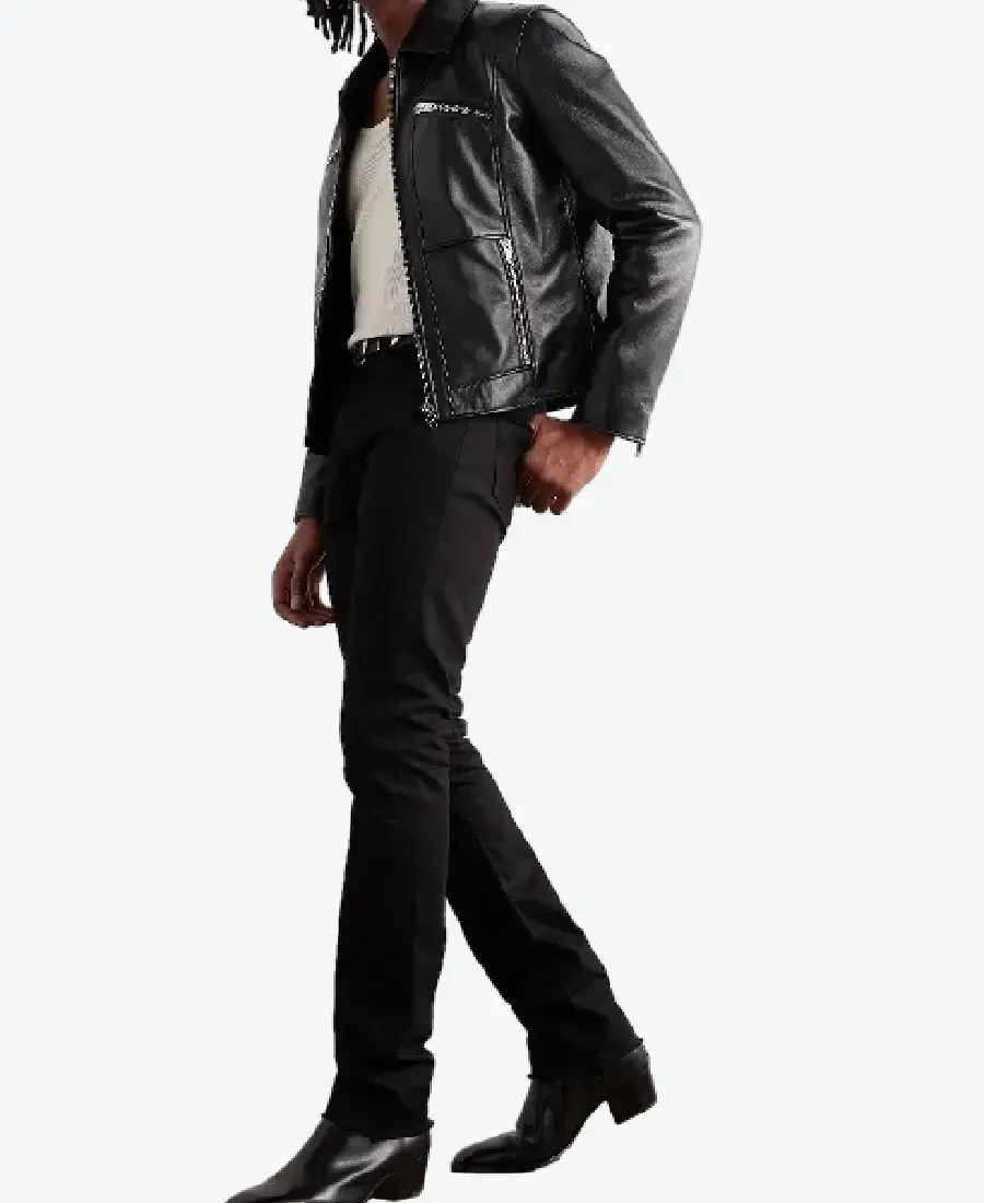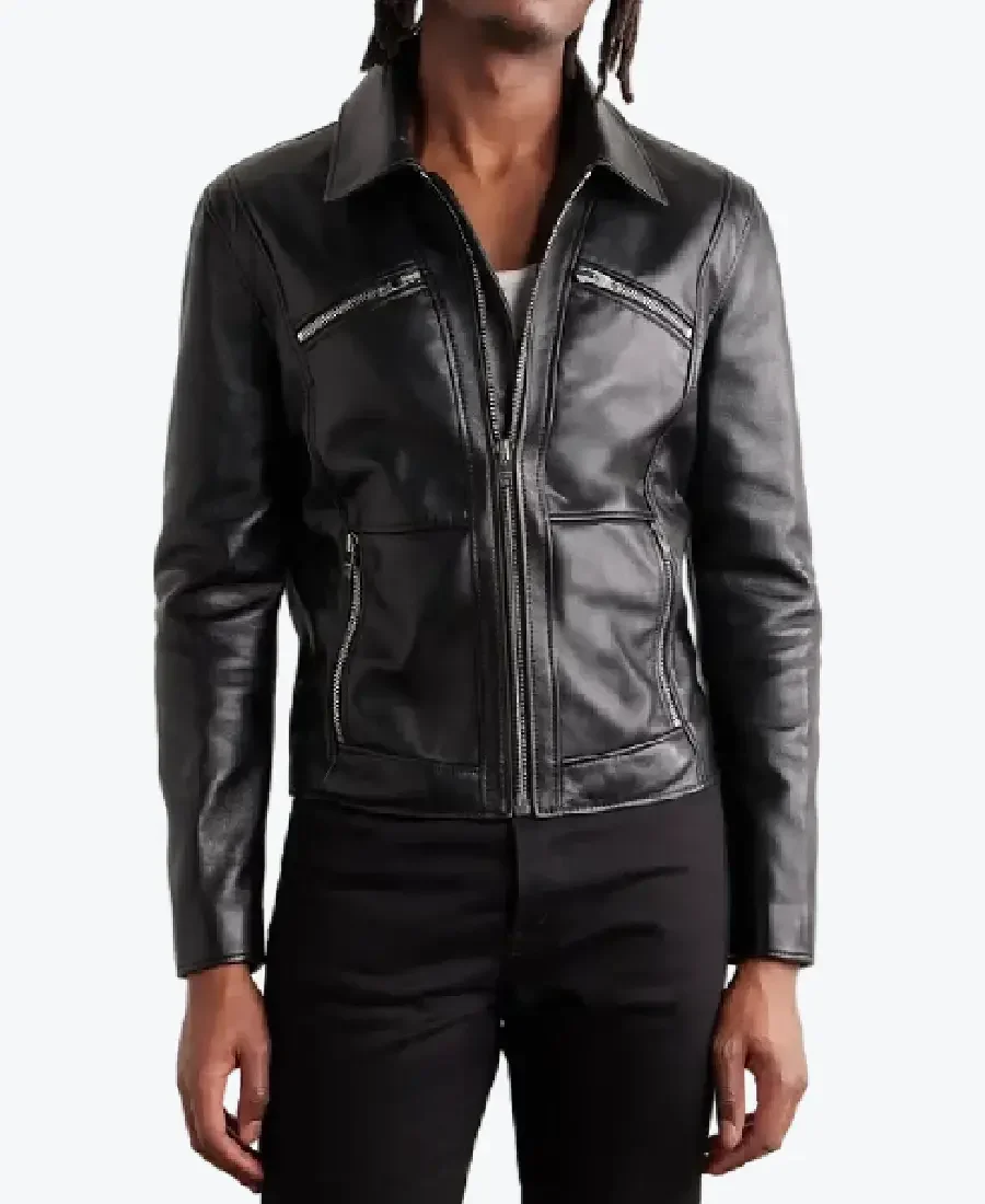 The architecture of this jacket is defined by its clean cropped silhouette and an iconic “modern-utility” aesthetic. It features a sharp shirt-style leather collar providing a structured and powerful frame to the neckline that exudes a classic professional vibe with a contemporary urban twist. The front is anchored by a high-performance silver-tone zipper closure, maintaining a precision tailored-fit profile that emphasizes a high-waisted, architectural drape. To ensure a custom look and a streamlined drape at the extremities, the full-length sleeves are finished with functional silver-tone zipper cuffs, while the expert vertical paneling and reinforced straight-cut hemline create a sophisticated architectural volume. Designed for the individual who demands maximum organized utility within a polished frame, this Rare Jackets essential features a strategic five-pocket configuration—including two external slanted zipper chest pockets, two prominent vertical zipper waist pockets, and a hidden inner pocket—offering secure storage while reinforcing the jacket’s sleek, high-impact silhouette.