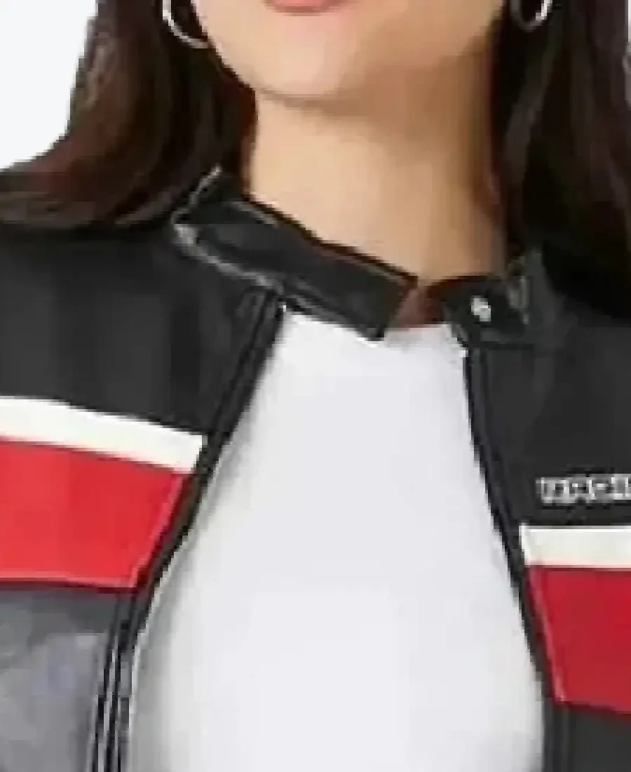 The architecture of this jacket is defined by its iconic cropped silhouette and high-contrast racing-inspired detailing. It features a contemporary erect collar with a secure snap-button closure, providing a streamlined and secure frame to the neckline. The high-impact design is further enhanced by horizontal red and white racing stripes across the chest and shoulders, lending a structured and powerful frame to the silhouette. The front is anchored by a high-performance centered zipper closure, maintaining a precision slim-fit profile that highlights the jacket’s architectural lines. To ensure a natural and relaxed drape at the wrists, the full-length sleeves are finished with clean open hem cuffs, allowing for effortless movement. Designed for the individual who demands standout utility within a high-impact frame, this Rare Jackets essential features a strategic two side zip pocket configuration, offering secure storage while reinforcing the jacket’s powerful, athletic silhouette.